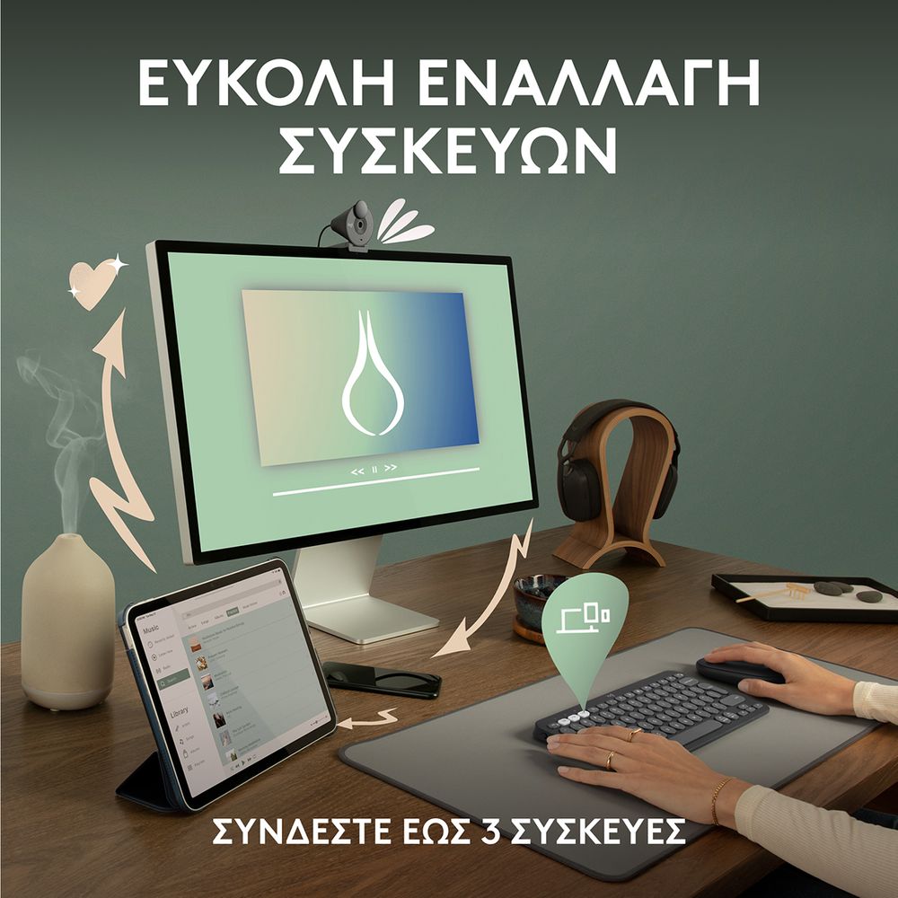 Αψήφησε τη μονοτονία με το μίνιμαλ πληκτρολόγιο Logitech Pebble Keys 2 K380s από ανακυκλωμένο πλαστικό. Χάρη στη μινιμαλιστική και κομψή σχεδίασή του και προσφέρει εξαιρετική φορητότητα. Κάνε εύκολη εναλλαγή μεταξύ 3 συσκευών, με τα κουμπιά Easy-Switch και κάνε τις εργασίες σου ταχύτερα με τα κουμπιά συντόμευσης Fn, όπως για την αποτύπωση οθόνης και την αναζήτηση. Εξατομίκευσε 10 πλήκτρα fn και τις συντομεύσεις με την εφαρμογή Logi Options+.