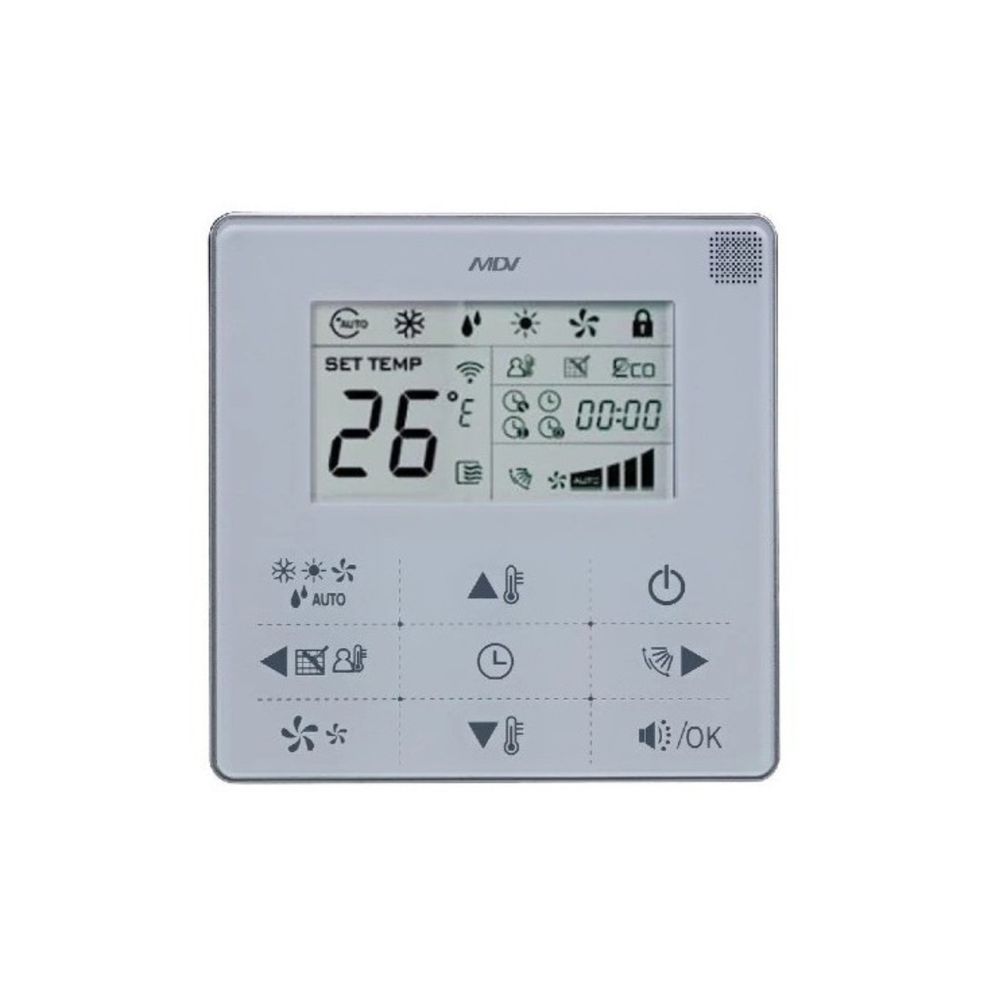 Με το ψηφιακό χειριστήριο MDV KJRP-86A1E ελέγχεις εύκολα το καναλάτο fan coil σου. Ρυθμίζεις θερμοκρασία με ακρίβεια, επιλέγεις λειτουργία ψύξης ή θέρμανσης και ρυθμίζεις την ταχύτητα του ανεμιστήρα (Low, Med, High, Auto). Η μεγάλη LCD οθόνη και ο χρονοδιακόπτης σου προσφέρουν άνεση και εξοικονόμηση ενέργειας