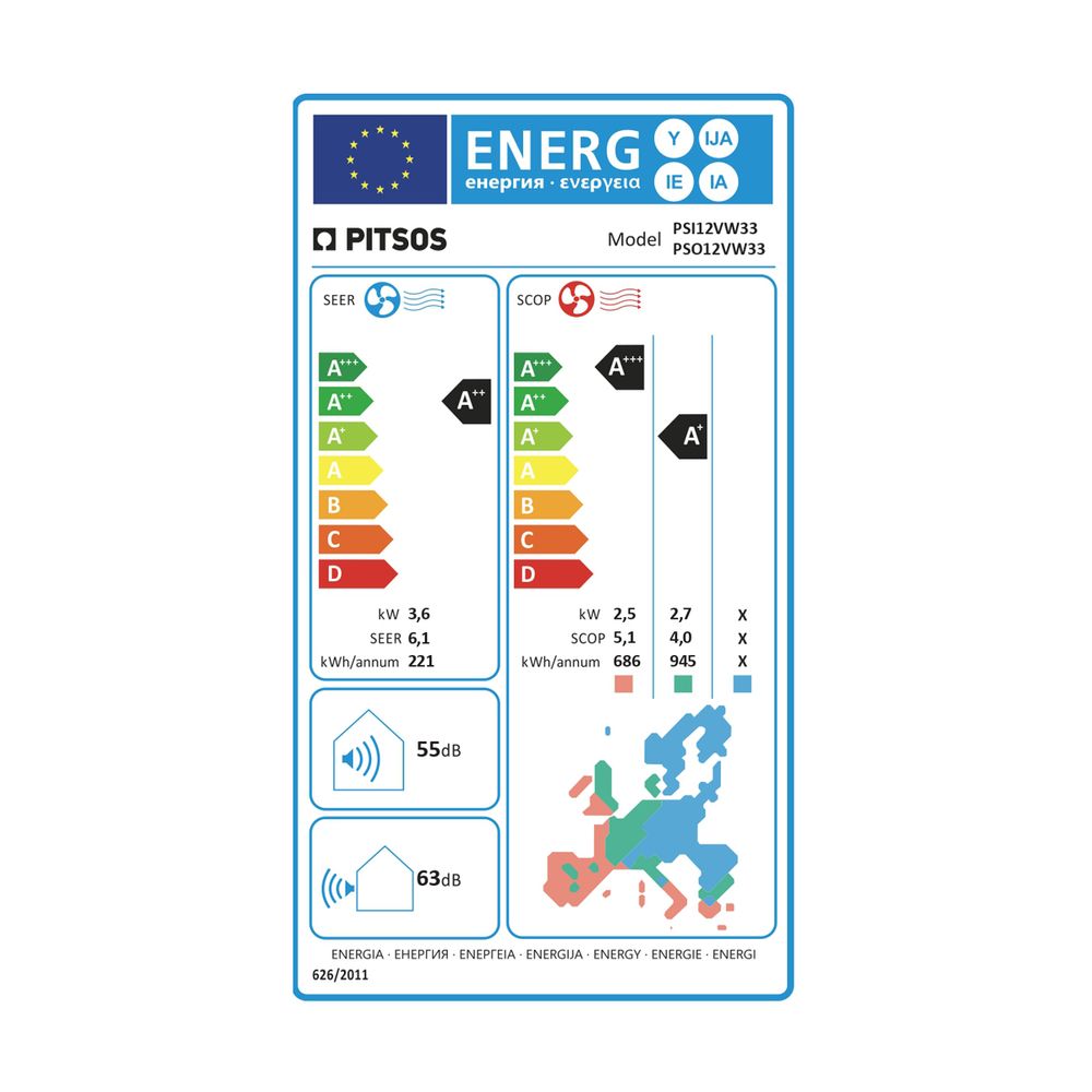 Κλιματιστικό Inverter Pitsos PSI12VW33 Φοίβη Comfort 12.000 BTU, ενεργειακής κλάσης Α++, με ιονιστή για ευχάριστο και καθαρό περιβάλλον, λειτουργία Follow Me για διατήρηση της επιθυμητής θερμοκρασίας στο σημείο που βρίσκεται το τηλεχειριστήριο και δυνατότητα απομακρυσμένου ελέγχου μέσω της εφαρμογής Home Connect.