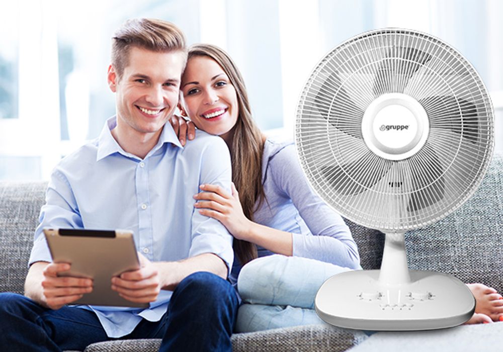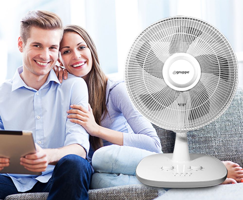 Ανεμιστήρας επιτραπέζιος Gruppe FT40-318 ισχύος 60 Watt, με διάμετρο 40 εκ, 3 ταχύτητες λειτουργίας, 5 πλαστικά πτερύγια περιστροφής, χρονόμετρο 60 λεπτών, μοτέρ με πηνία χαλκού και αθόρυβη λειτουργία.