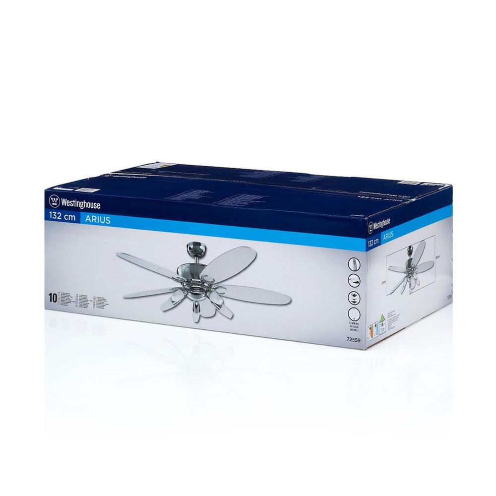 Ανεμιστήρας οροφής Arius από τη Westinghouse, μοντέρνας αισθητικής σε χρώμιο και με πτερύγια δύο όψεων (λευκό/μαύρο) για να επιλέξεις την απόχρωση που ταιριάζει στη δική σου διακόσμηση. Με διάμετρο 132cm/52”, καλύπτει χώρους έως και 36m2, επιτυγχάνοντας τη μείωση στην αίσθηση της θερμοκρασίας έως και 8˚C (ανάλογα το χώρο και το κλίμα).