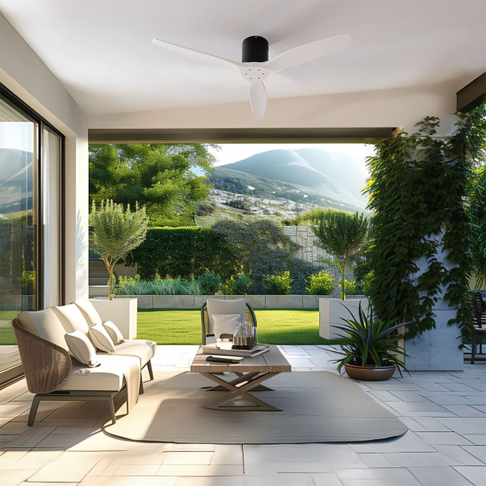 Ανεμιστήρας οροφής με ισχύ 40W, 3 πτερύγια αεροδυναμικού σχεδιασμού, DC μοτέρ, ρυθμιζόμενο χρονοδιακόπτη εώς 4 ώρες, συνδεσιμότητα Wi-Fi για χειρισμό από το κινητό τηλέφωνο, δυνατότητα διπλής κατεύθυνσης των φτερωτών για την καλοκαιρινή και την χειμερινή περίοδο και προστασία IP44.