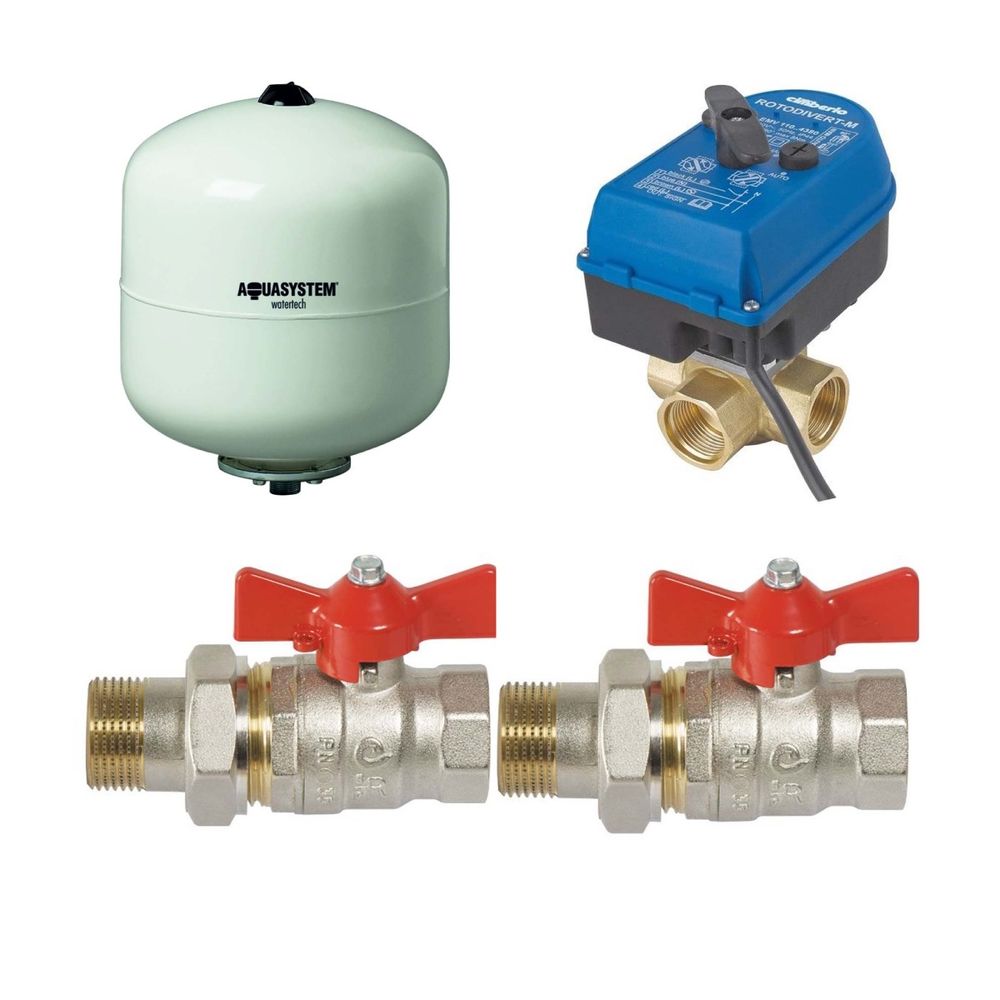 Το πακέτο Κ2 ΖΝΧ βασικής εγκατάστασης περιλαμβάνει το AquaSystem Δοχείο Διαστολής AR 24Lt Plus Λευκό, τη Cimberio Βάνα Εκτροπής 1" Τρίοδη με Ηλ. Μοτέρ art.685, τη Comisa Βάνα Σφαιρική Ολικής Παροχής Πεταλούδα Α-Θ 1" με Ρακόρ art.140B και τη Comisa Βάνα Σφαιρική Ολικής Παροχής Πεταλούδα Α-Θ 1 1/4" με Ρακόρ art.140B.