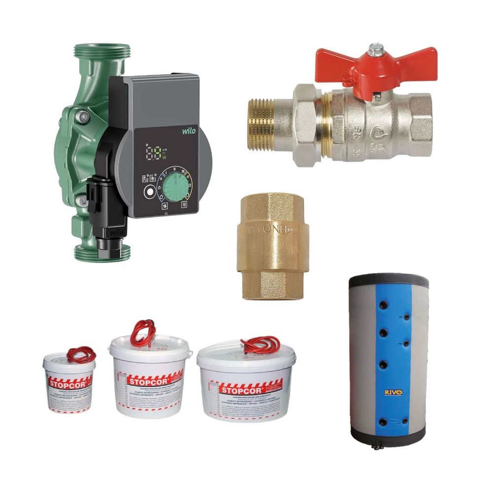 Το πακέτο Κ3 hybrid premium εγκατάστασης περιλαμβάνει το Rivo SAC0 100Lt με μεταλλικό περίβλημα δοχείο αδράνειας, τη βαλβίδα αντεπιστροφής 1 1/4" με ελατήριο, Comisa βάνα σφαιρική ολικής παροχής πεταλούδα Α-Θ 1 1/4" με Ρακόρ art.140B, το Stopcor Α1 60.000kcal ανόδιο μαγνησίου και τον Wilo Yonos Pico (1,0 Ή 2,0) 30/1-8 PN10 ηλεκτρονικό κυκλοφορητή.