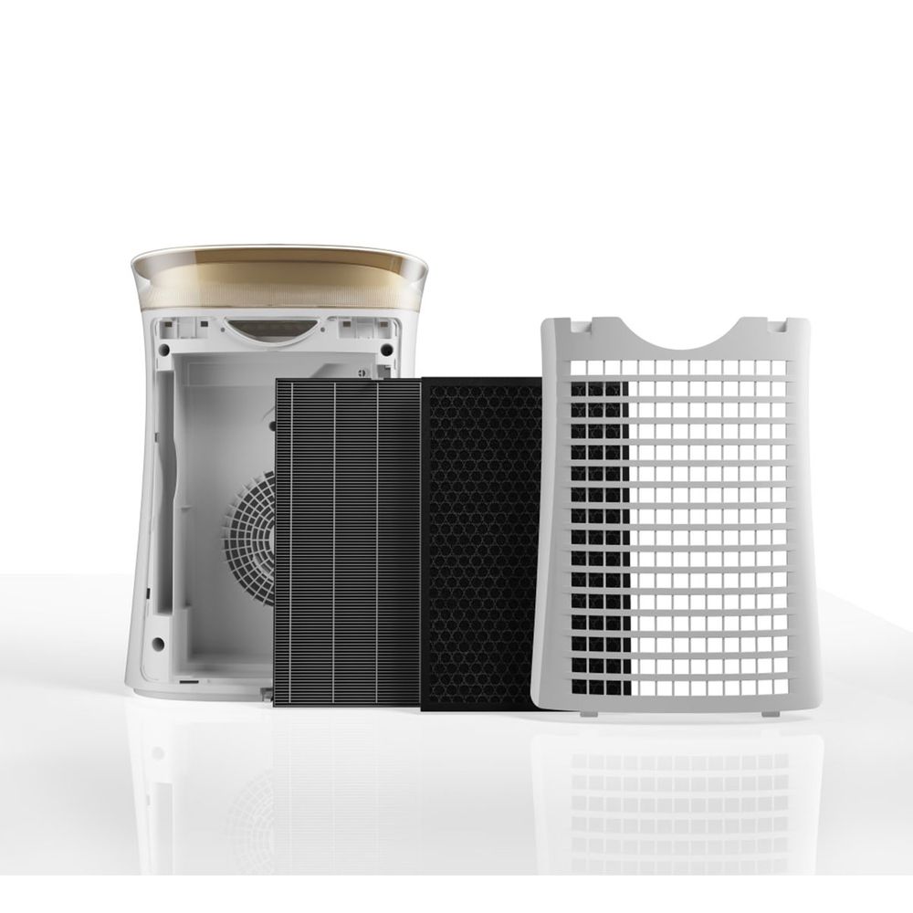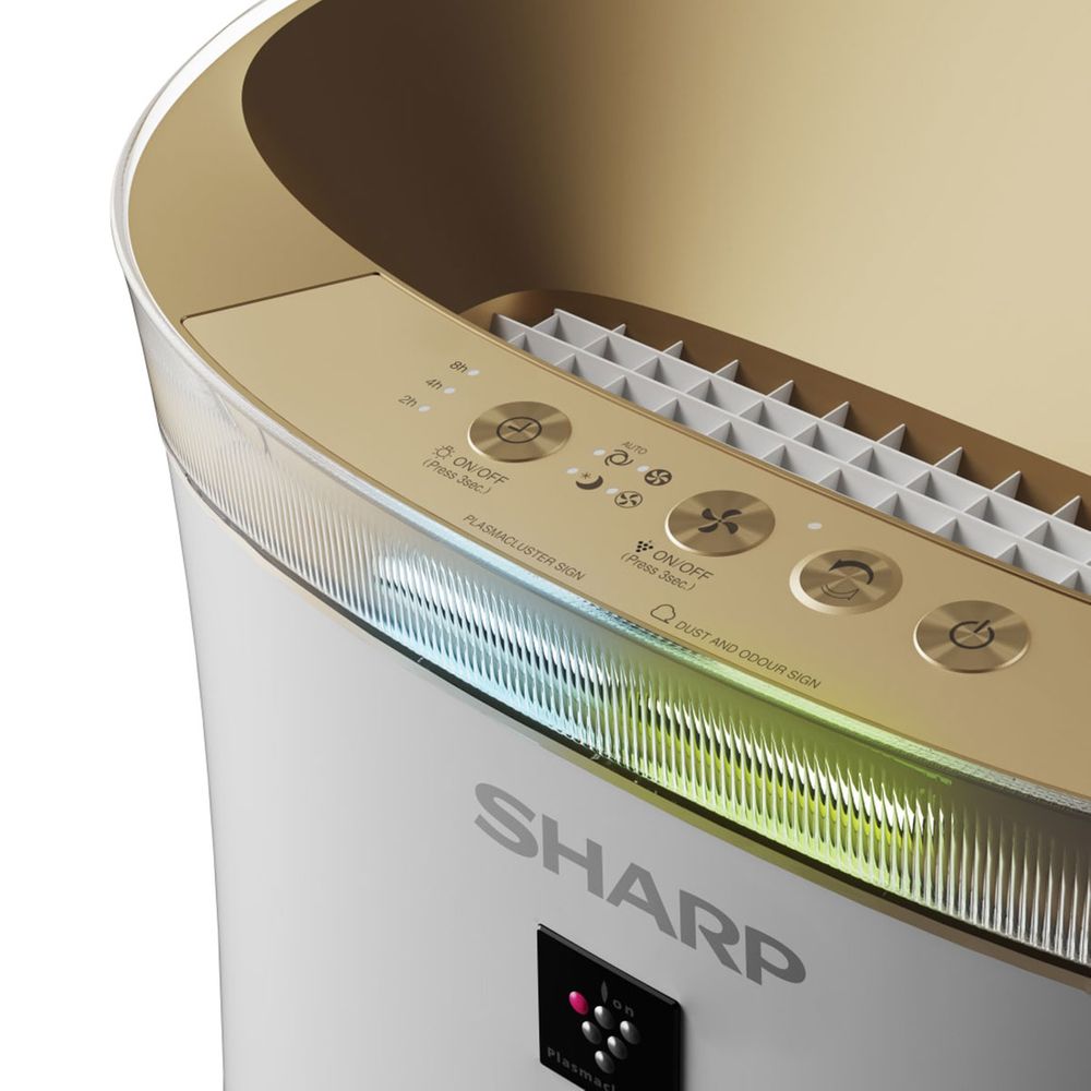 Καθαριστής αέρα Sharp με τεχνολογία ιόντων Plasmacluster που εκπέμπει θετικά και αρνητικά ιόντα με 3 επίπεδα φιλτραρίσματος για να καθαρίζει τον αέρα και να βελτιώνει την υγρασία του δέρματος.