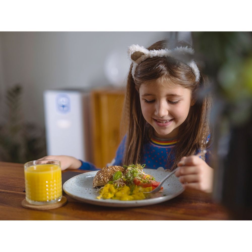 Ο καθαριστής αέρα AF 50 με τεχνολογία αισθητήρα λέιζερ, αυτόματη λειτουργία, οθόνη, φιλτράρισμα H13 και ενεργού άνθρακα αφαιρεί παθογόνα, λεπτή σκόνη, αλλεργιογόνα και οσμές σε δωμάτια με μέγεθος από 50 έως 65 m².