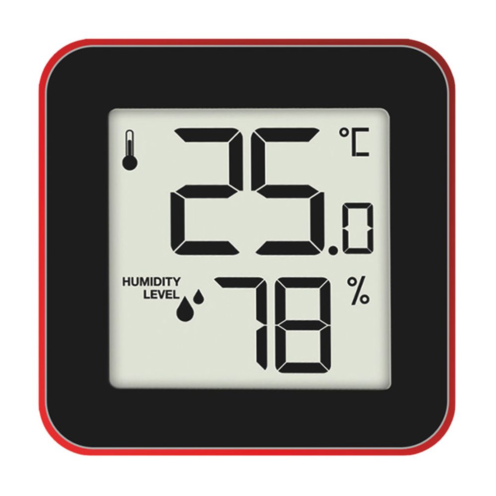 Ψηφιακό θερμόμετρο και υγρόμετρο εσωτερικού χώρου, με πλαίσιο αλουμινίου σε κόκκινο χρώμα.