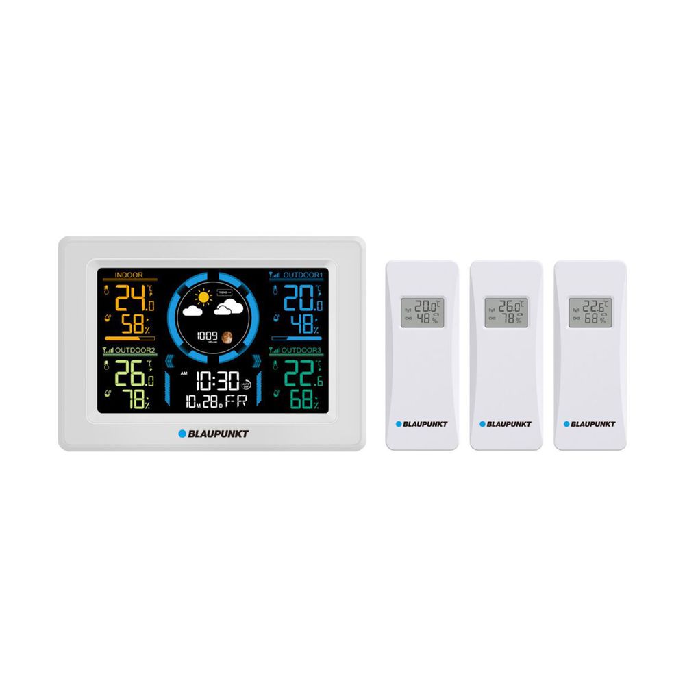 Μετεωρολογικός σταθμός Blaupunkt με τρεις ασύρματους αισθητήρες θερμοκρασίας και υγρασίας, ένδειξη απόλυτης βαρομετρικής πίεσης, ένδειξη τάσης θερμοκρασίας και υγρασίας, ρολόι και ημερολόγιο με λειτουργία συναγερμού και ένδειξη φάσης σελήνης.