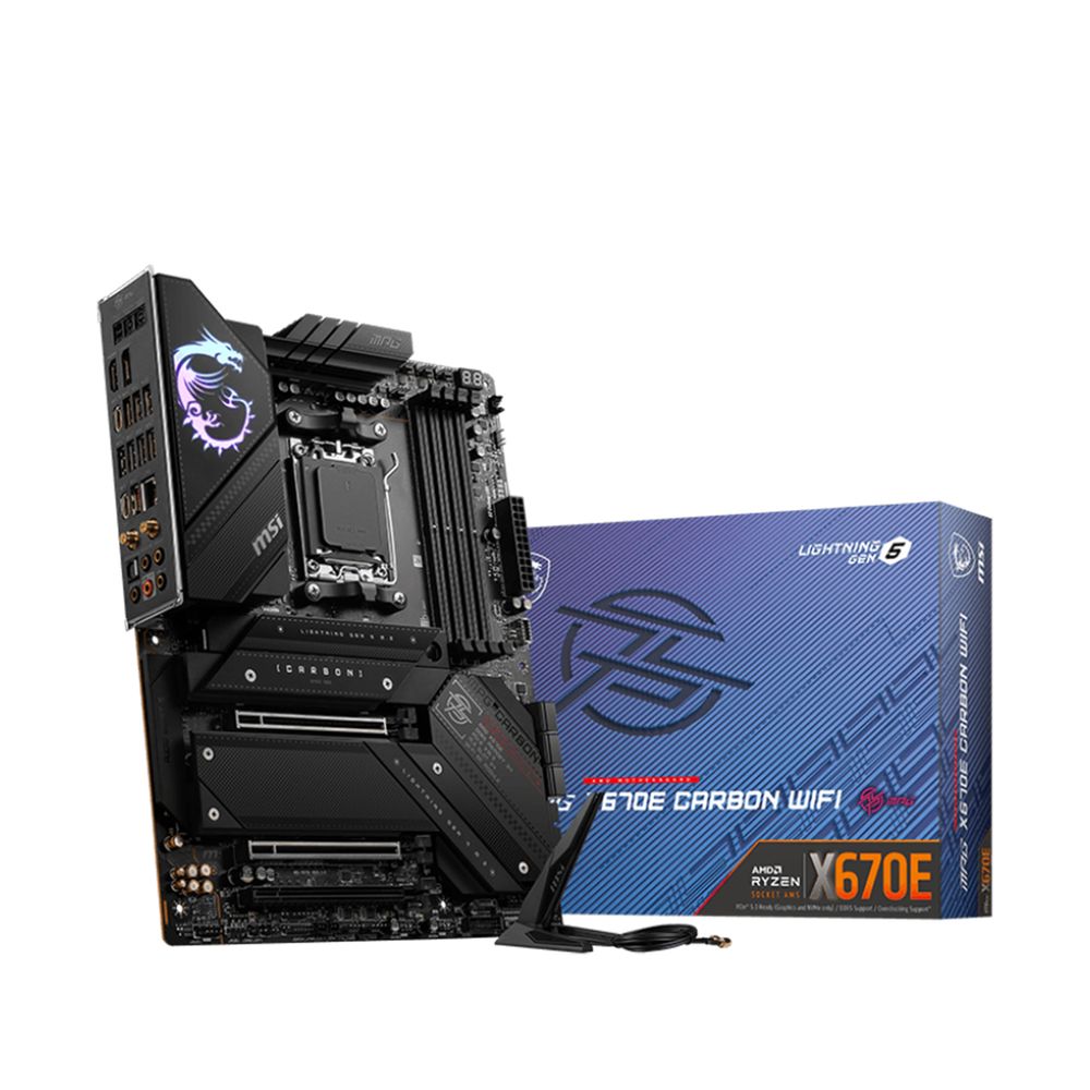 Μητρική H/Y MPG X670E Carbon Wi-Fi από την εταιρεία MSI, μεγέθους ATX, με πολλές δυνατότητες, με chipset AMD X670 και δέχεται επεξεργαστές Zen 4 (Socket AM5). Υποστηρίζει μνήμη DDR5 έως 128GB και έχει υποδοχές 1x PCI Express x16 5.0 και 1x PCI Express x16 4.0.