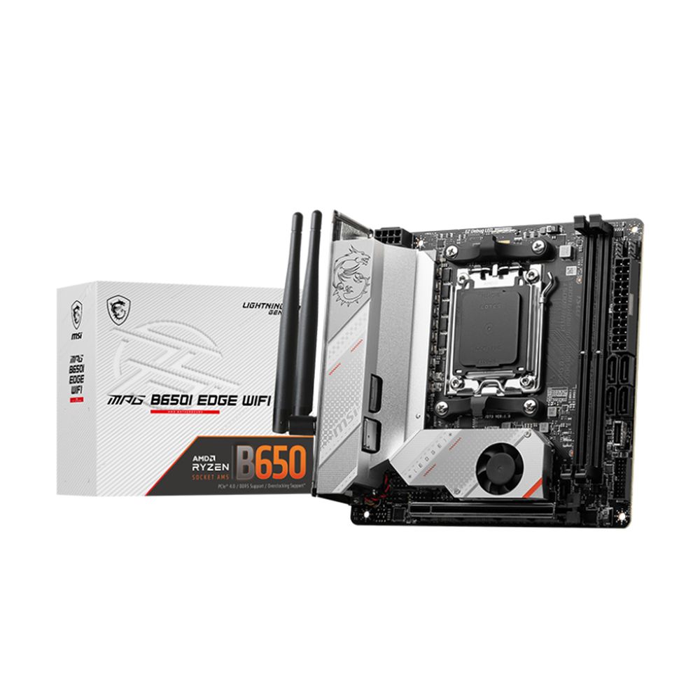 Μητρική H/Y MPG B650I Edge Wi-Fi από την εταιρεία MSI, μεγέθους Mini-ITX, με πολλές δυνατότητες, με chipset AMD B650 και δέχεται επεξεργαστές Zen 4 (Socket AM5). Υποστηρίζει μνήμη DDR5 έως 128GB και έχει υποδοχές 1x PCI Express x16 4.0