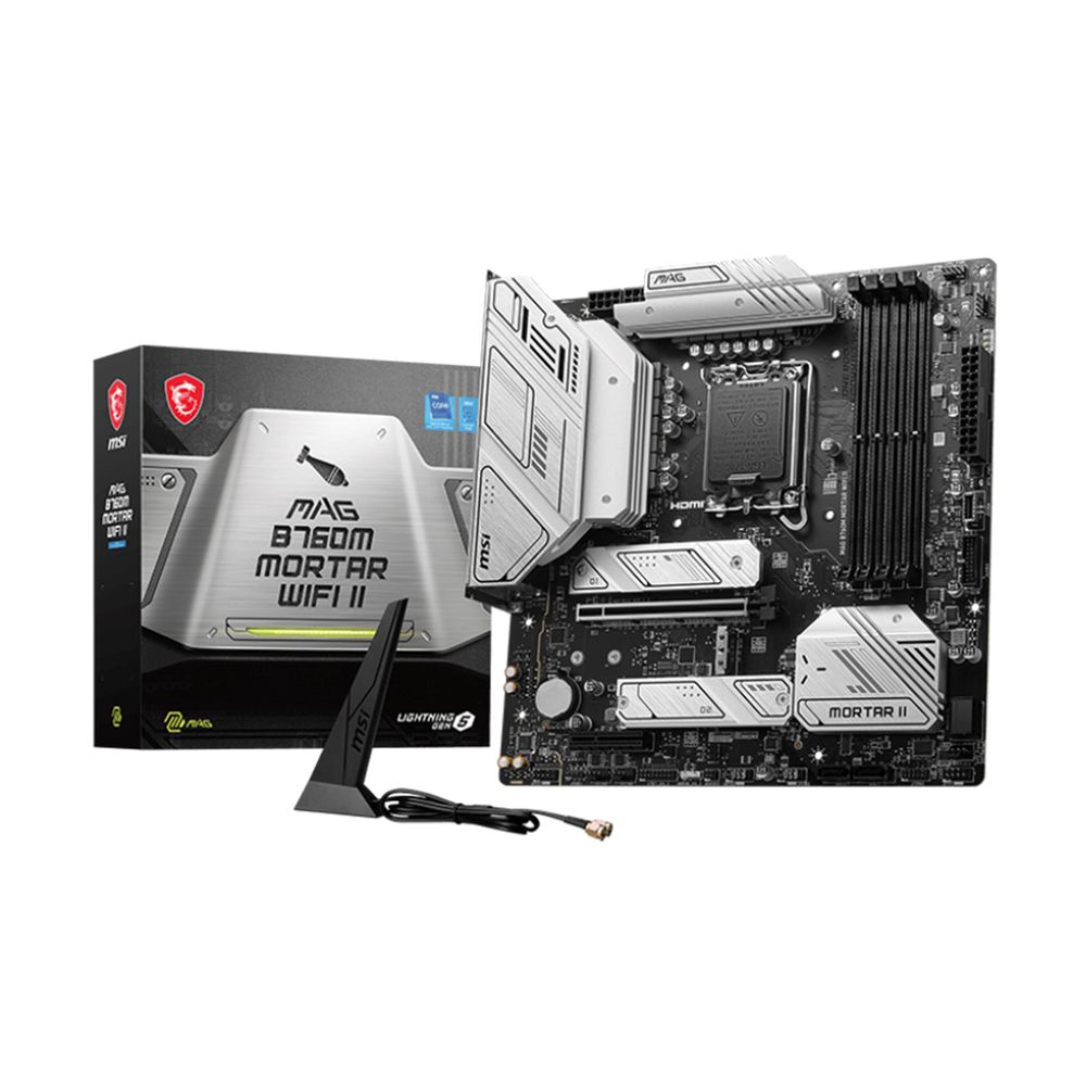 Μητρική κάρτα MAG B760M Mortar Wi-Fi II της MSI για H/Y με επεξεργαστή Intel και υποδοχή 1700, συμβατή με μνήμες DDR5. Υποστηρίζει έως 2 SSD M.2 και 4 αποθηκευτικές μονάδες SATA III 6GB/s. Διαθέτει 1 υποδοχή PCI Express 5.0 για κάρτες γραφικών και επεκτάσεις. Περιλαμβάνει 3 θύρες USB 3.2 και 4 θύρες USB 2.0 πίσω, 1 θύρα USB-C 3.2, και συνδέσεις DisplayPort και HDMI για οθόνες. Διαθέτει επίσης WiFi και Bluetooth.
