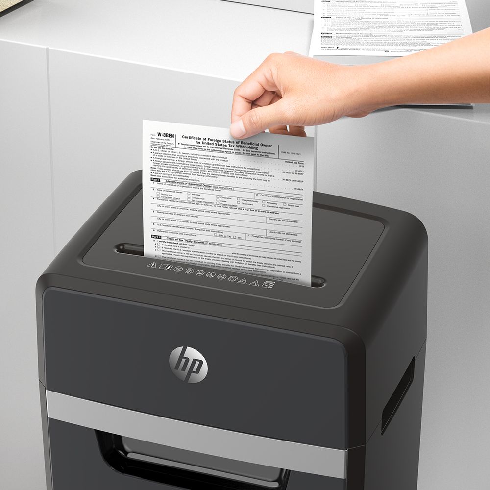 Καταστροφέας εγγράφων της εταιρείας HP με χωρητικότητα κάδου 30 λίτρα. Είναι η πιο ασφαλής μέθοδος κοπής, καθώς κόβει σε πολύ μικρά κομμάτια καθιστώντας το αδύνατο να ενωθούν ξανά, αλλά λειτουργεί με πιο χαμηλές ταχύτητες σε σύγκριση με τα υπόλοιπα είδη καταστροφέων. Δέχεται 16 έγγραφα ανά λειτουργία για ταχύτερη καταστροφή περισσότερων εγγράφων.