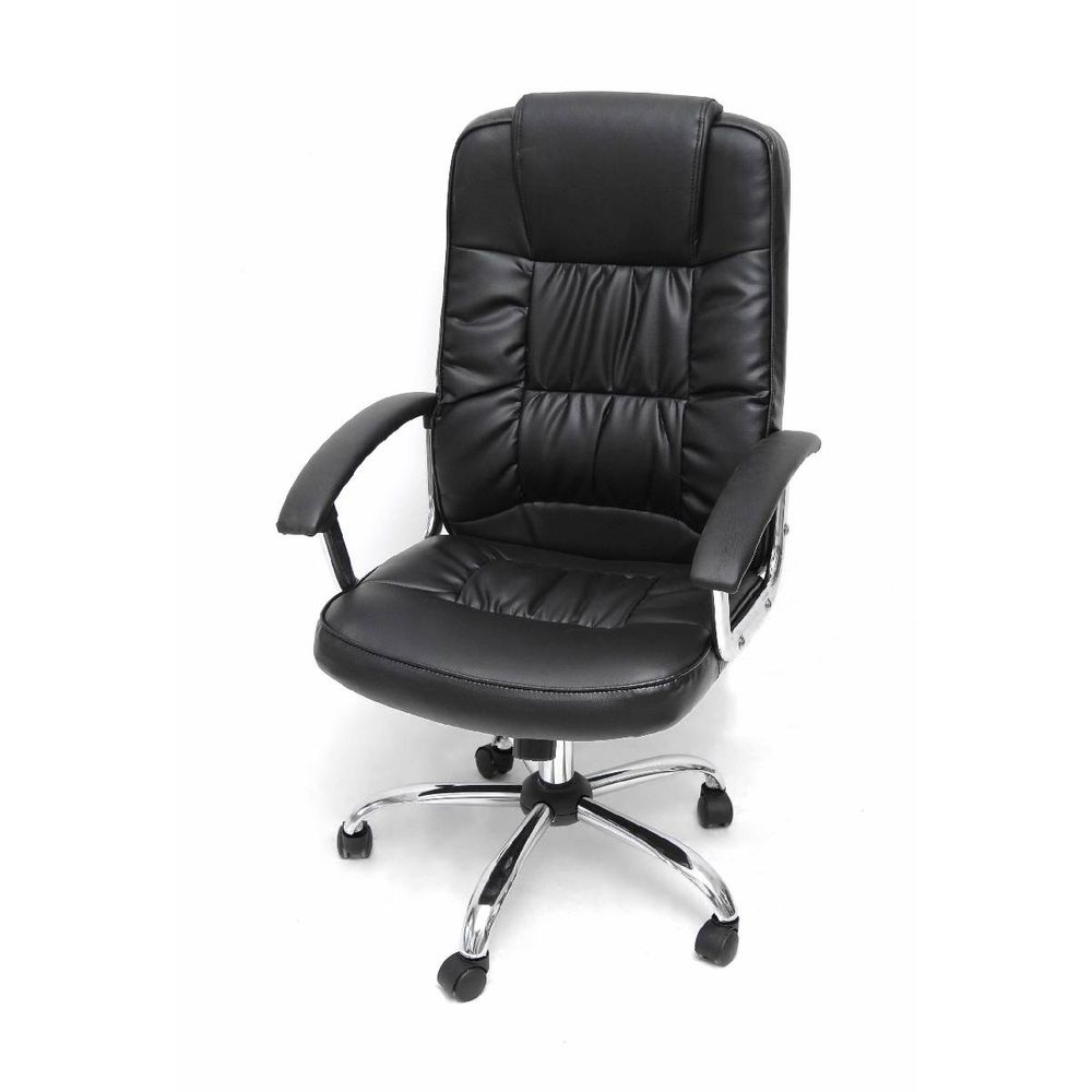 Πολυθρόνα γραφείου της Velco σε μαύρο χρώμα. Η επιφάνειά της είναι PVC και διαθέτει μεταλλικά μπράτσα χρωμίου με επένδυση PU. Διαθέτει επίσης μηχανισμό λειτουργιών ανάκλισης και ανύψωσης.