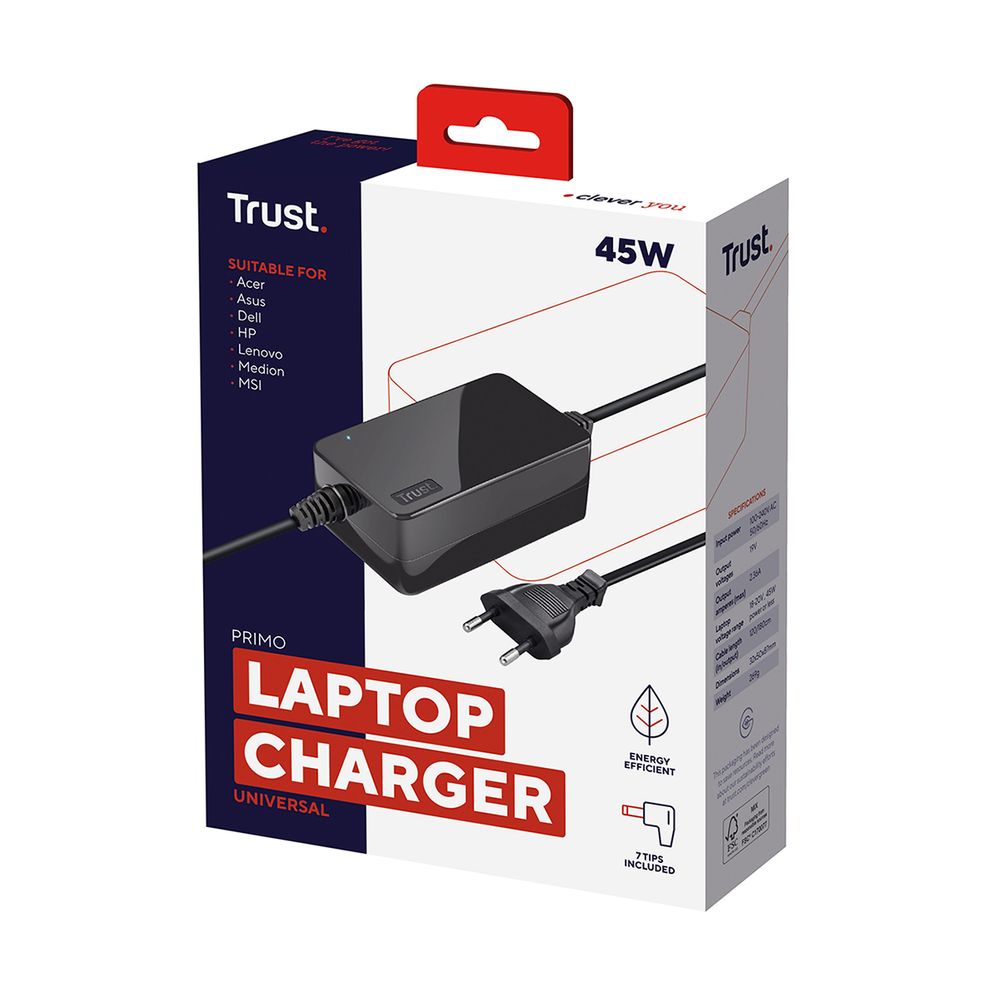 Ο γενικός φορτιστής φορητού υπολογιστή Trust Primo 45W μπορεί να χρησιμοποιηθεί με σχεδόν οποιοδήποτε φορητό υπολογιστή που απαιτεί τροφοδοτικό 45W ή λιγότερο. Απλώς επιλέγεις μία από τις παρεχόμενες υποδοχές και φορτίζεις τον φορητό υπολογιστή Acer, Asus, Dell, HP, Lenovo, Medion ή MSI. Λειτουργεί με τις τάσεις της πρίζας τοίχου παντού στον κόσμο, που σημαίνει ότι μπορείς να φορτίζεις με ασφάλεια τον φορητό υπολογιστή σου οπουδήποτε.