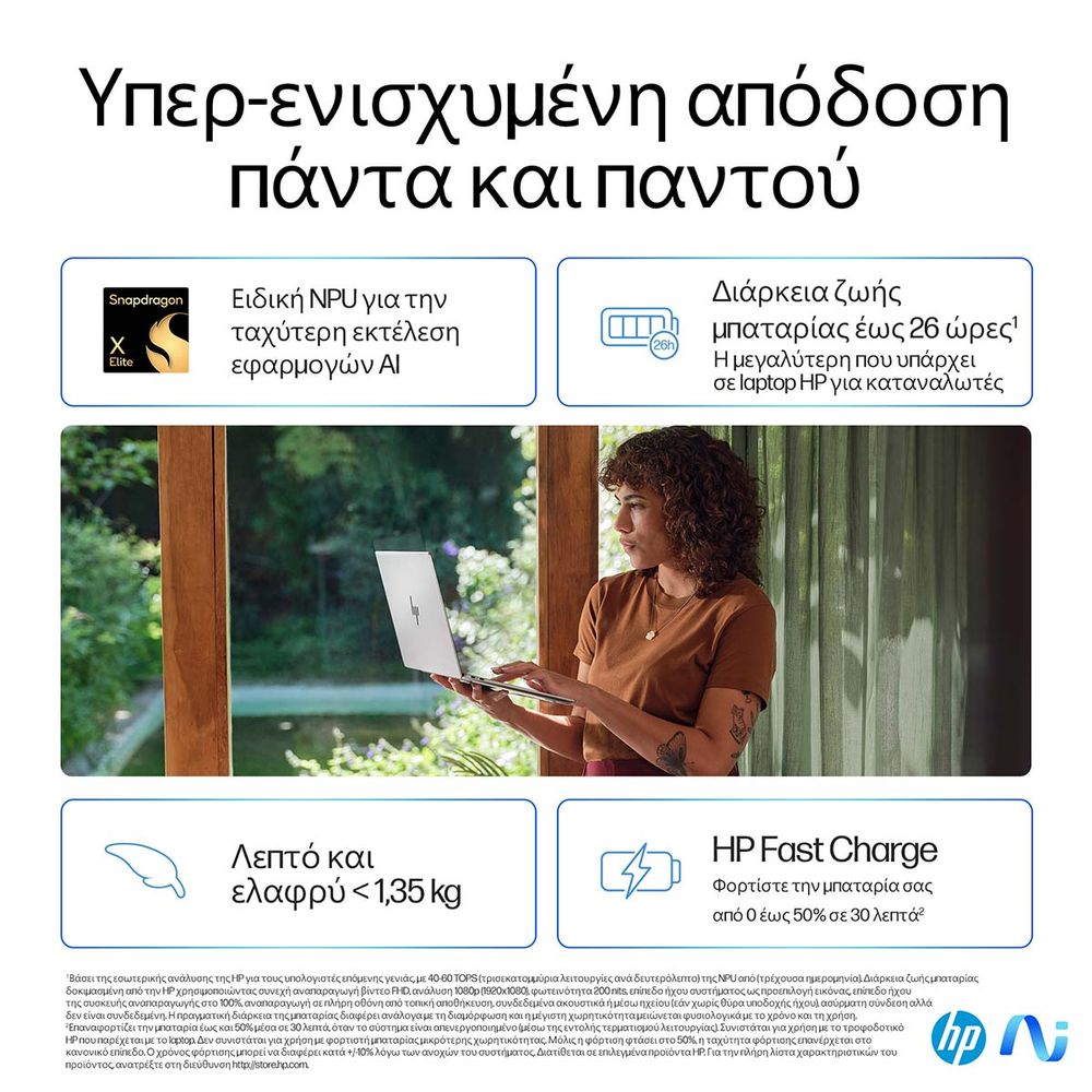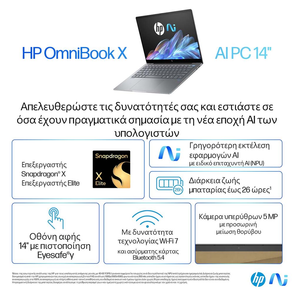 Απελευθέρωσε τις δυνατότητες σου με τη νέα εποχή των υπολογιστών Copilot+ που βασίζεται στην τεχνητή νοημοσύνη. Με την υποστήριξη του Snapdragon X Elite, με τεχνητή νοημοσύνη με αποκλειστική NPU και διάρκεια ζωής μπαταρίας έως 26 ώρες, το νέο OmniBook X AI θα ανεβάσει την παραγωγικότητά σου στο επόμενο επίπεδο. Η κάμερα 5MP με εφέ Windows Studio και τα καλύτερα εργαλεία συνεργασίας θα βελτιώσουν τις συνδέσεις σου χωρίς διακοπές.
