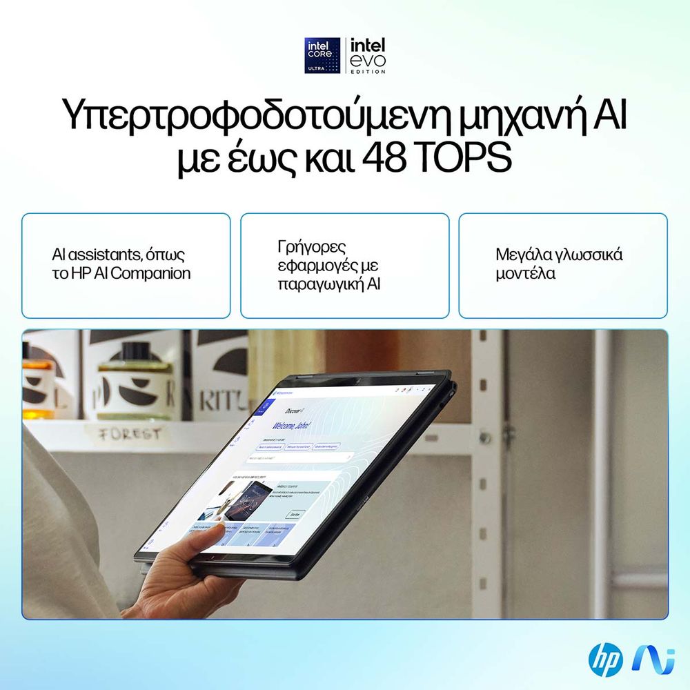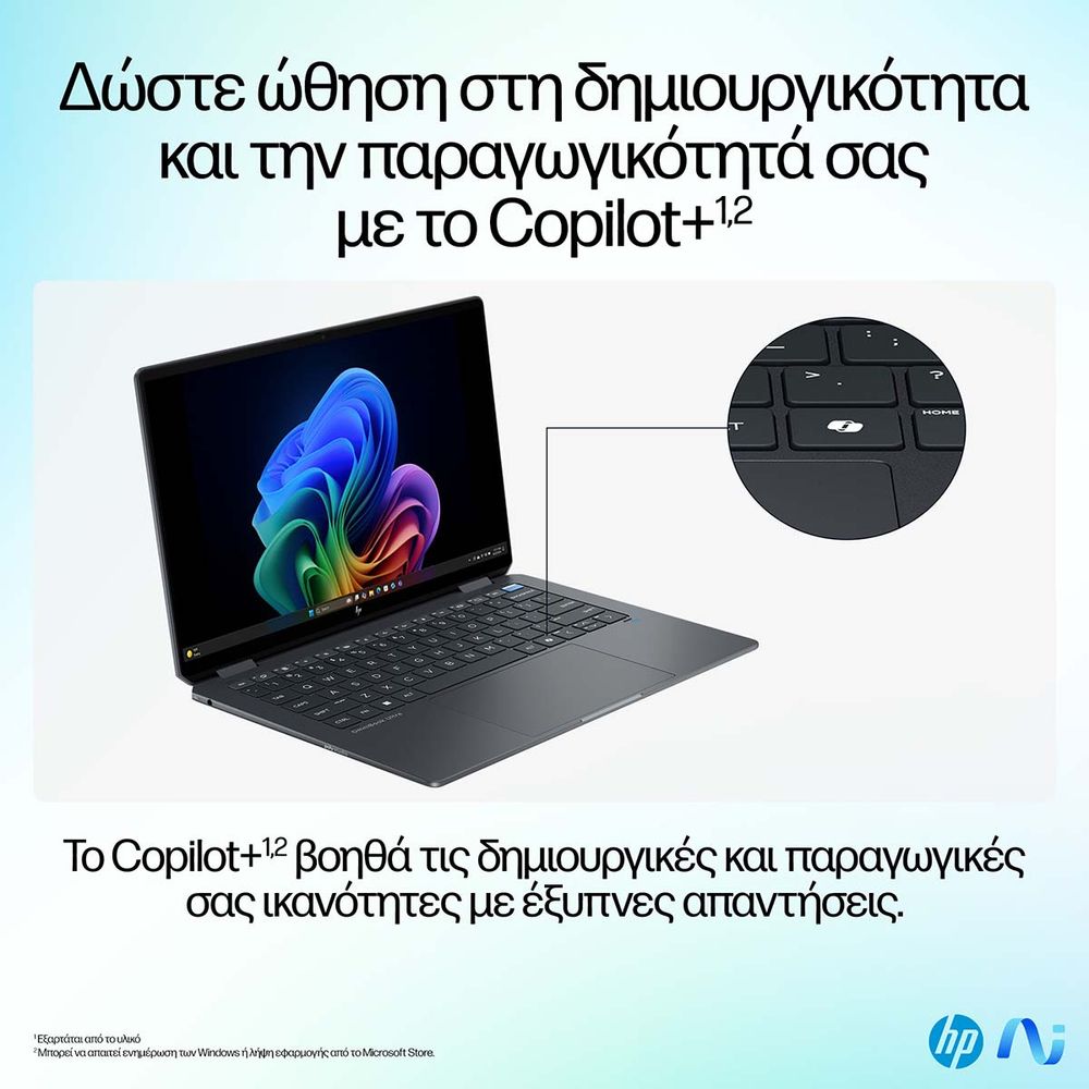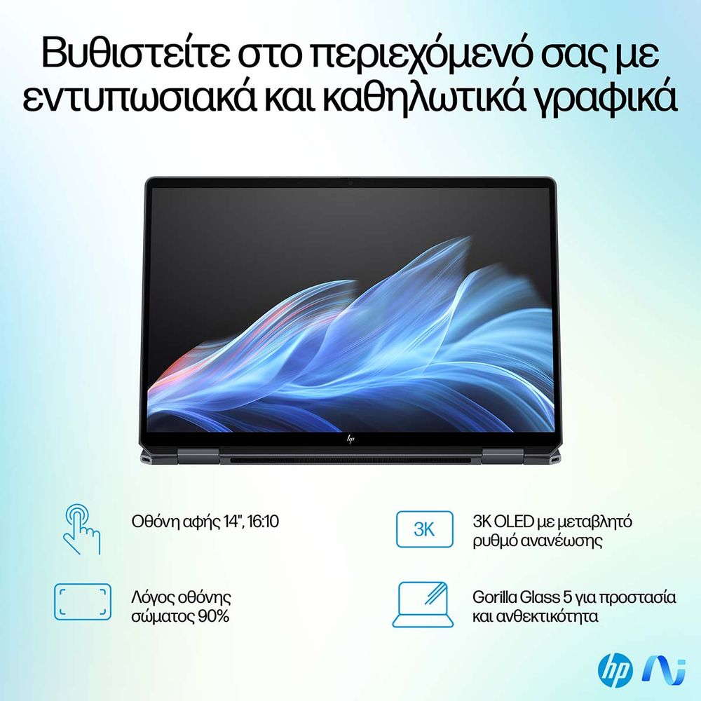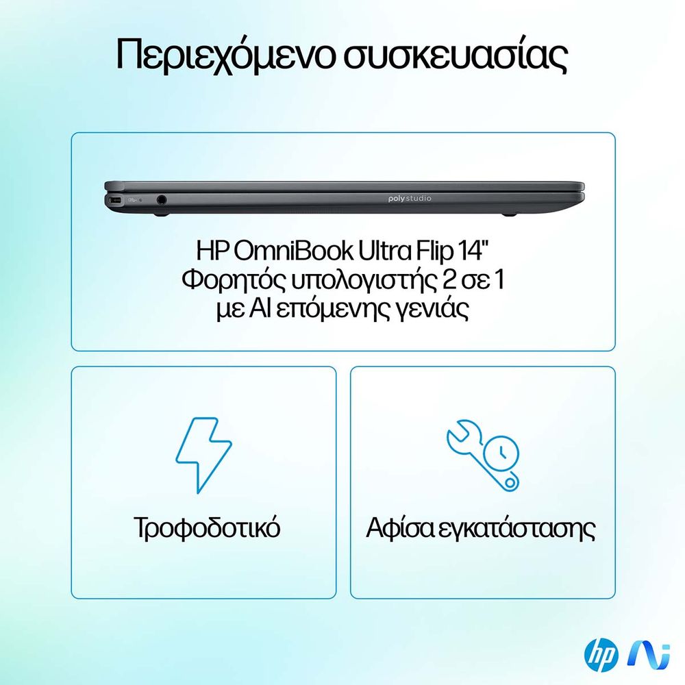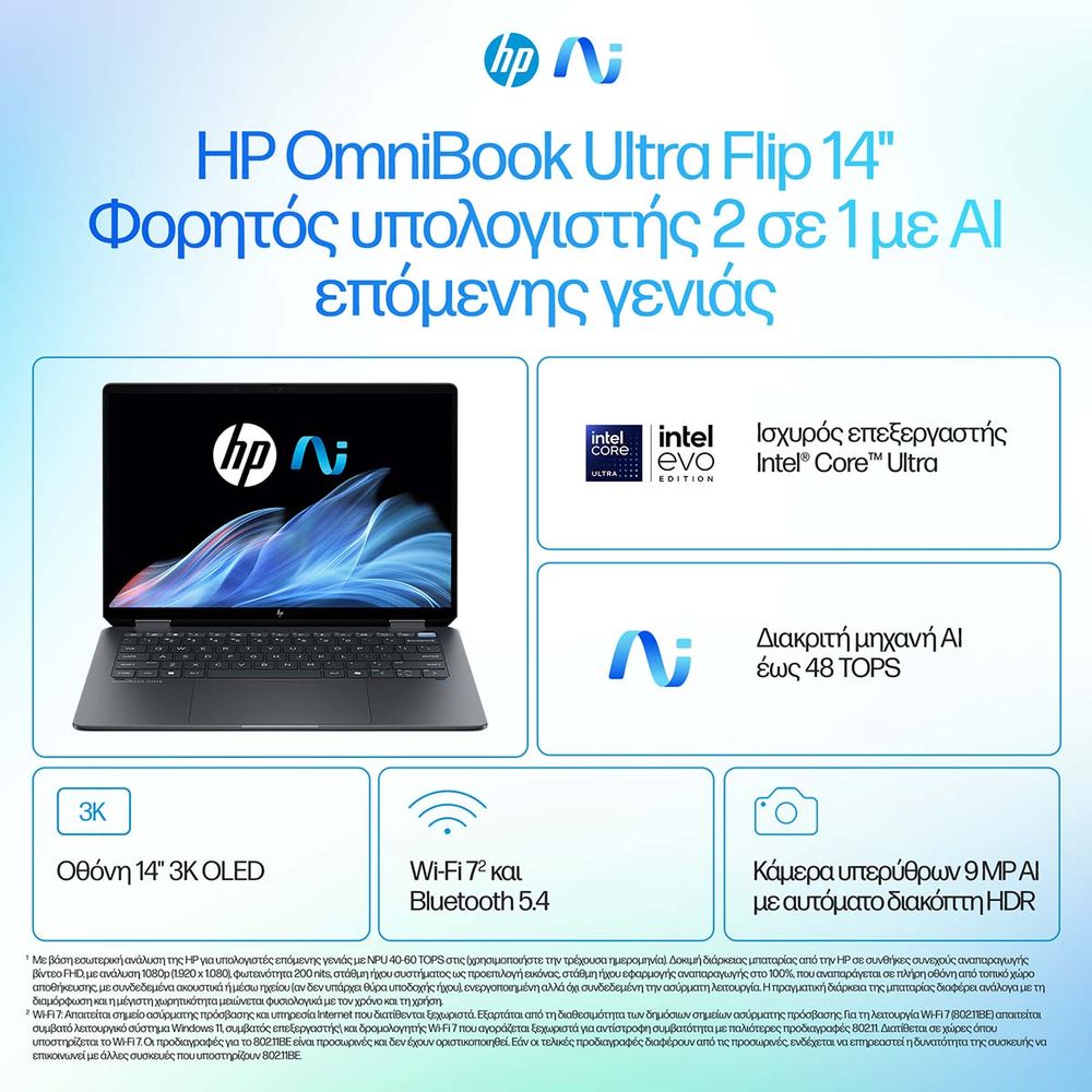 Το HP OmniBook Ultra Flip είναι ένα προηγμένο laptop που συνδυάζει ισχύ, φορητότητα και κομψό σχεδιασμό. Με επεξεργαστή Intel Core Ultra 5, 16GB LPDDR5x RAM και 1TB SSD, προσφέρει υψηλή απόδοση για κάθε εργασία. Η οθόνη αφής 14" 2.8K OLED παρέχει εκπληκτική ευκρίνεια και ζωντανά χρώματα. Χάρη στην ενσωμάτωση τεχνολογιών τεχνητής νοημοσύνης και των γραφικών Intel Arc, μπορείς να δημιουργείς, να παίζεις και να κάνεις streaming χωρίς περιορισμούς.