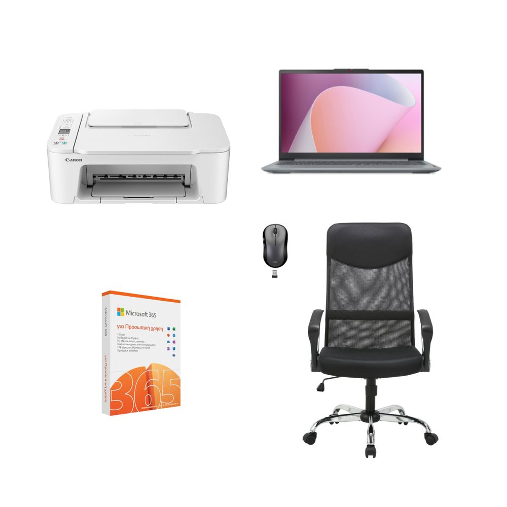Σετ φοιτητικού tech 2 πακέτου που αποτελείται από το laptop IdeaPad Slim 3 15AMN8, ασύρματο ποντίκι Logik LWLMSL23K, η καρέκλα γραφείου Sandstorm SHBCH25K, το πολυμηχάνημα Canon Pixma TS3751I και το Microsoft 365 για Προσωπική χρήση του Office.