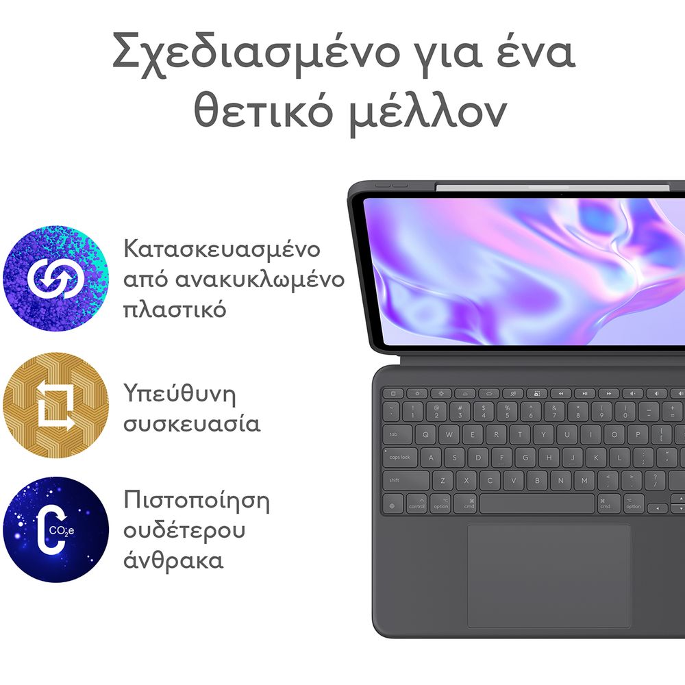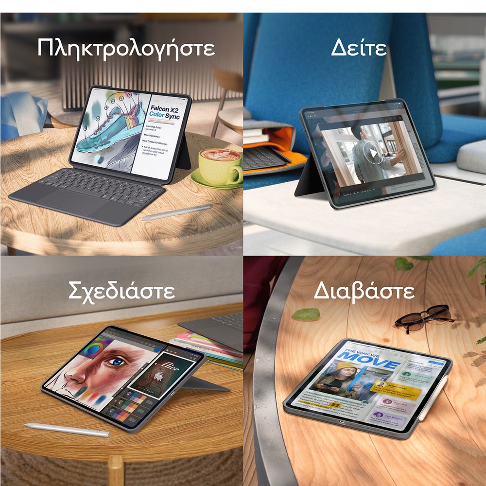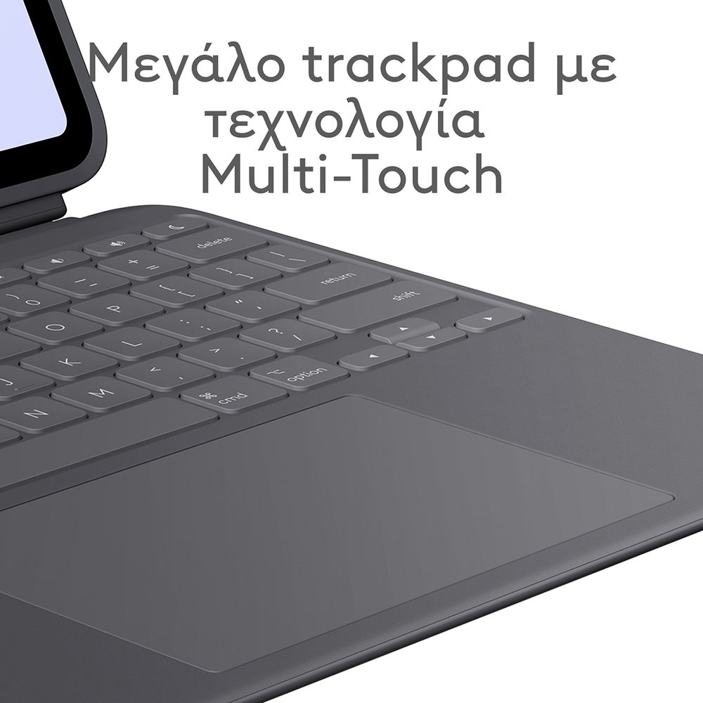 Πληκτρολόγησε, σχεδίασε, παρακολούθησε και διάβασε με τη θήκη-πληκτρολόγιο Combo Touch. Το ευέλικτο στήριγμα και το αποσπώμενο πληκτρολόγιο πλήρους μεγέθους προσφέρουν πολλές λειτουργίες χρήσης για οποιαδήποτε εργασία. Επέκτεινε τις δυνατότητες του iPad με το μεγαλύτερο trackpad το οποίο προσφέρει μια ανώτερη, διαισθητική εμπειρία παρακολούθησης κίνησης χάρη στον γνώριμο έλεγχο μέσω κινήσεων που παρέχει η τεχνολογία Multi-Touch.