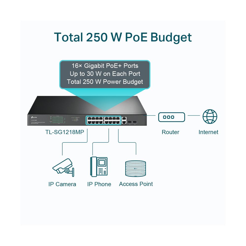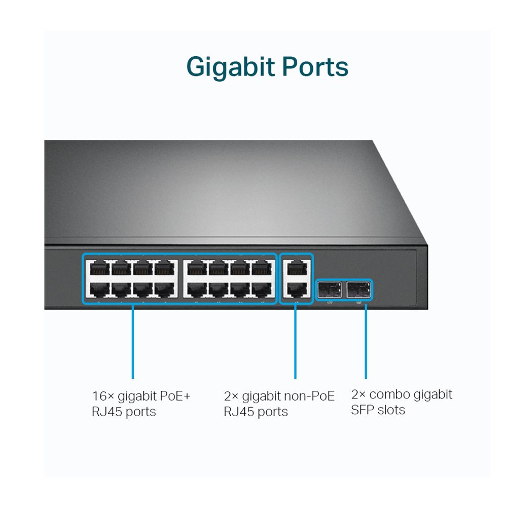 Κάλυψε τις ανάγκες συνδεσιμότητας της επιχείρησης σου με 16x gigabit PoE+ RJ45 θύρες, 2x gigabit non-PoE RJ45 θύρες και 2x combo υποδοχές gigabit SFP. Παρέχει υψηλή ισχύ με έως και 30 W για κάθε θύρα PoE και 250 W για όλες τις θύρες PoE.