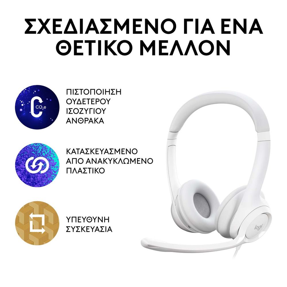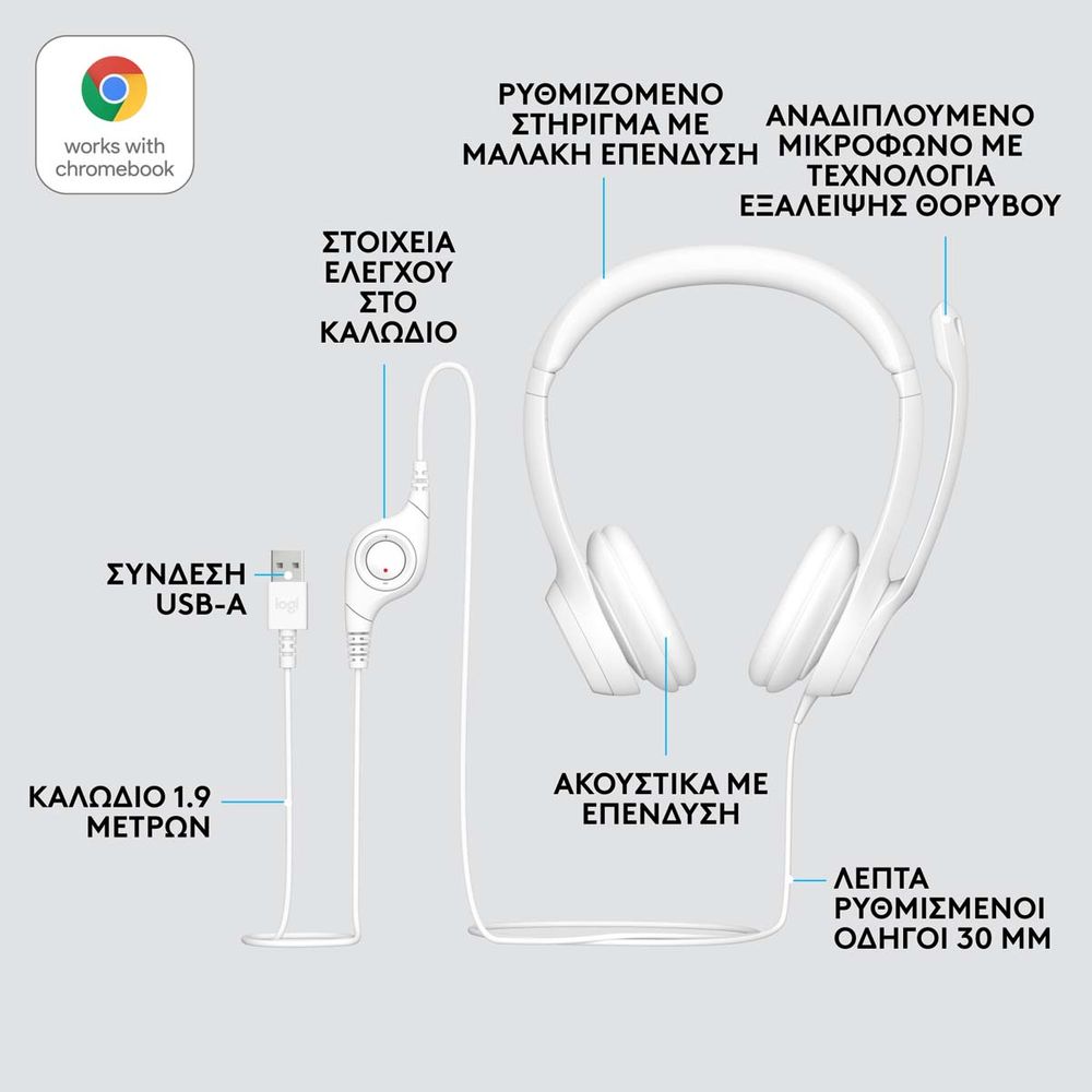 Ενσύρματο σετ μικροφώνου-ακουστικών H390 της Logitech, με πεντακάθαρο ήχο και εύχρηστα στοιχεία ελέγχου στο καλώδιο. Απόλαυσε πεντακάθαρες κλήσεις, με απλή σύνδεση σε USB και άμεση λειτουργία, και μικρόφωνο εξάλειψης θορύβου. Χάρη στα στοιχεία ελέγχου στο καλώδιο, ελέγχεις την ένταση ή τη σίγαση χωρίς να διακόπτεις τις κλήσεις σου. Οι προσεκτικά ρυθμισμένοι οδηγοί των ακουστικών προσφέρουν βελτιωμένο, ψηφιακό ήχο για συσκέψεις, μουσική και άλλα.