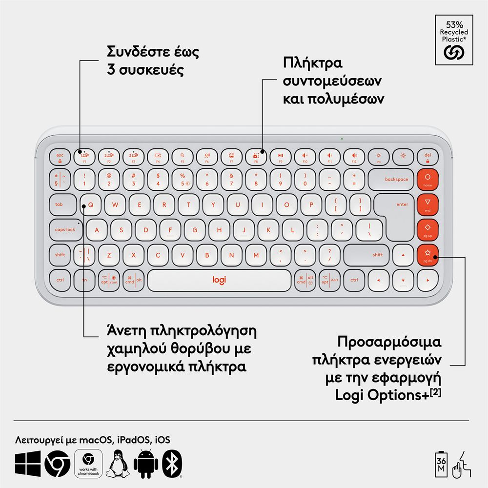 Δώσε στυλ στο γραφείο σου με το ασύρματο πληκτρολόγιο Pop Icon Keys, ένα μικρό πληκτρολόγιο με τολμηρή αισθητική και άνετη πληκτρολόγηση. Απόλαυσε άνεση με τα εργονομικά πλήκτρα χαμηλού προφίλ για άνετη, εμπειρία πληκτρολόγησης χαμηλού θορύβου που θυμίζει φορητό υπολογιστή και κάνε τη ζωή σου πιο εύκολη με τα προσαρμόσιμα πλήκτρα ενεργειών και την εφαρμογή Logi Options+, με εναλλαγή μεταξύ εργασίας και διαλείμματος χωρίς κόπο.