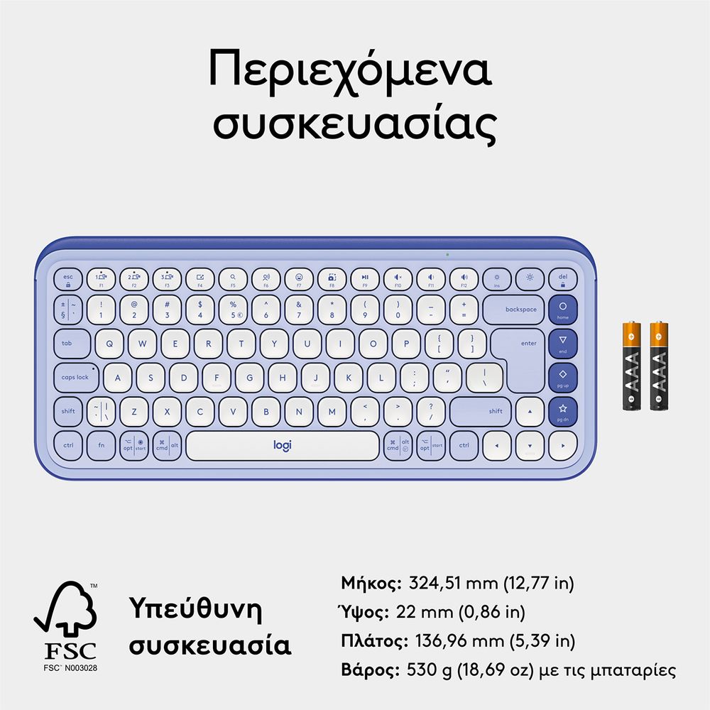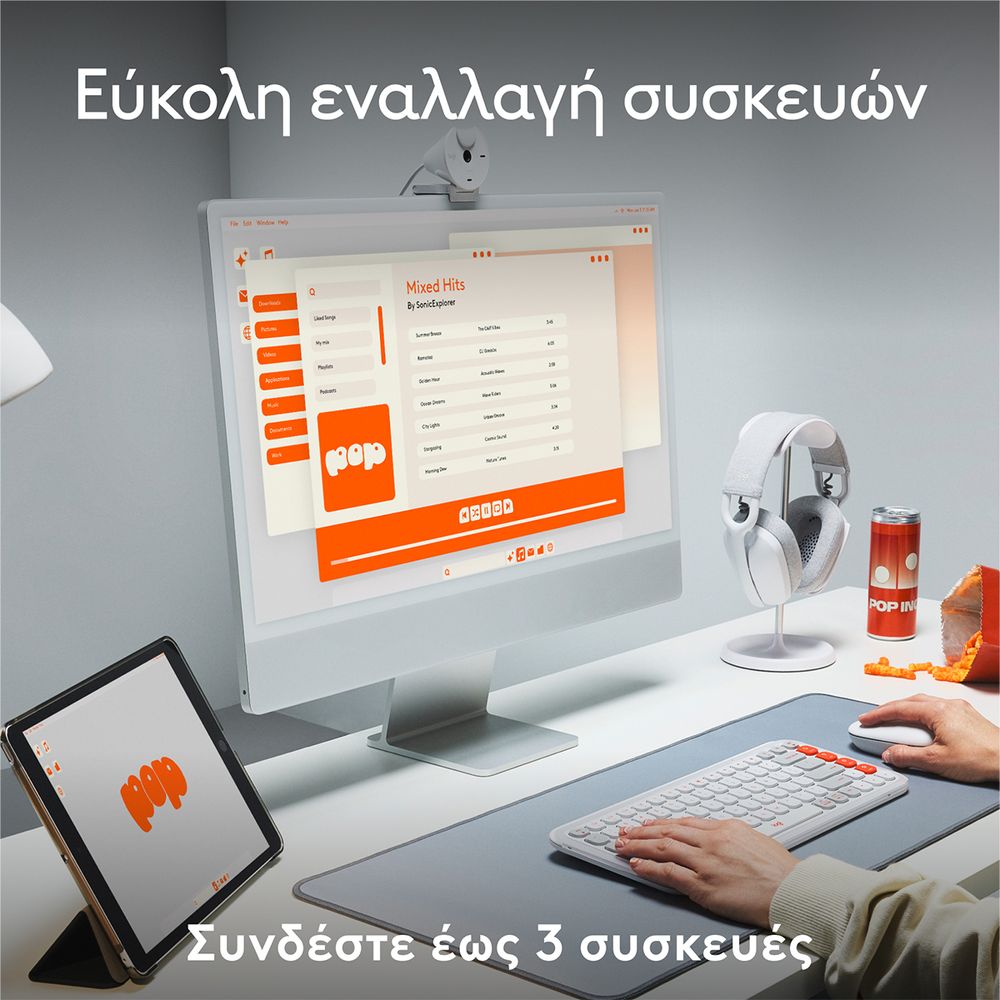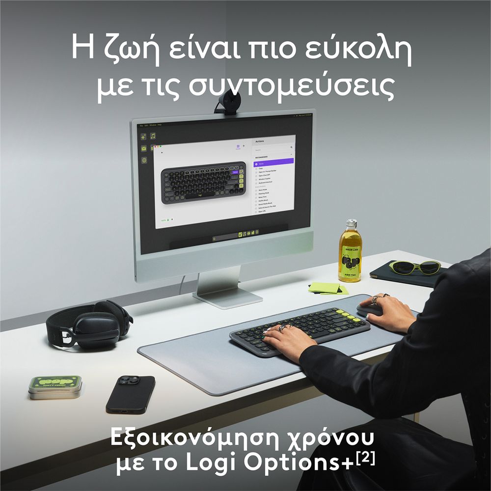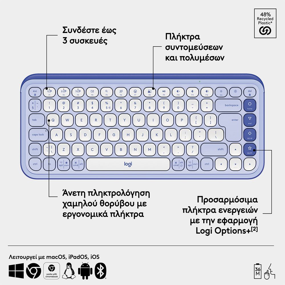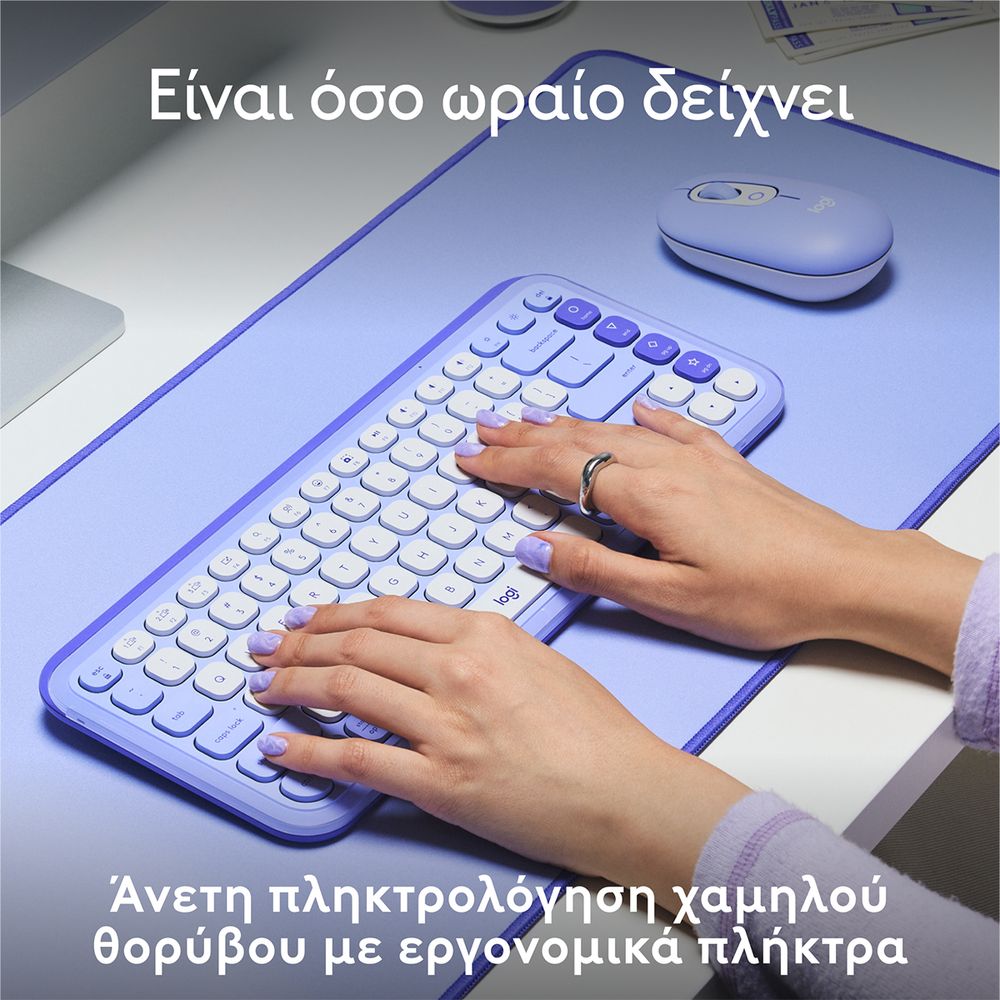 Δώσε στυλ στο γραφείο σου με το ασύρματο πληκτρολόγιο Pop Icon Keys, ένα μικρό πληκτρολόγιο με τολμηρή αισθητική και άνετη πληκτρολόγηση. Απόλαυσε άνεση με τα εργονομικά πλήκτρα χαμηλού προφίλ για άνετη, εμπειρία πληκτρολόγησης χαμηλού θορύβου που θυμίζει φορητό υπολογιστή και κάνε τη ζωή σου πιο εύκολη με τα προσαρμόσιμα πλήκτρα ενεργειών και την εφαρμογή Logi Options+, με εναλλαγή μεταξύ εργασίας και διαλείμματος χωρίς κόπο.