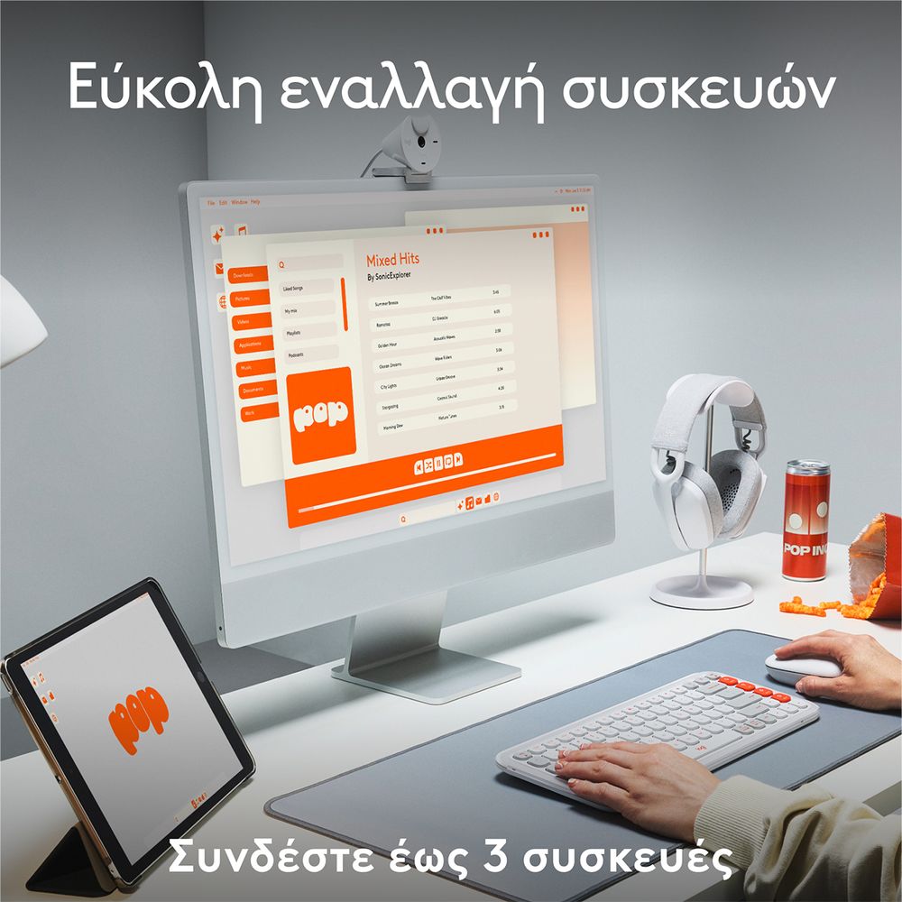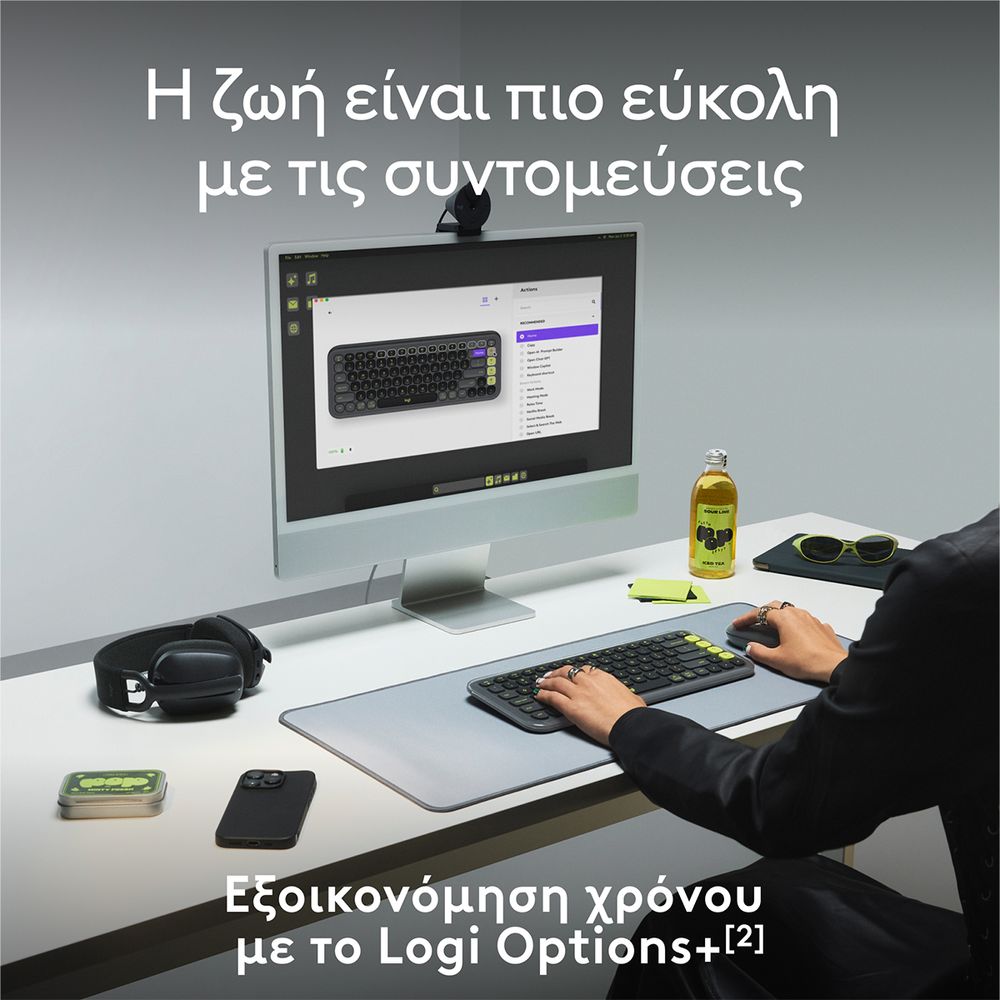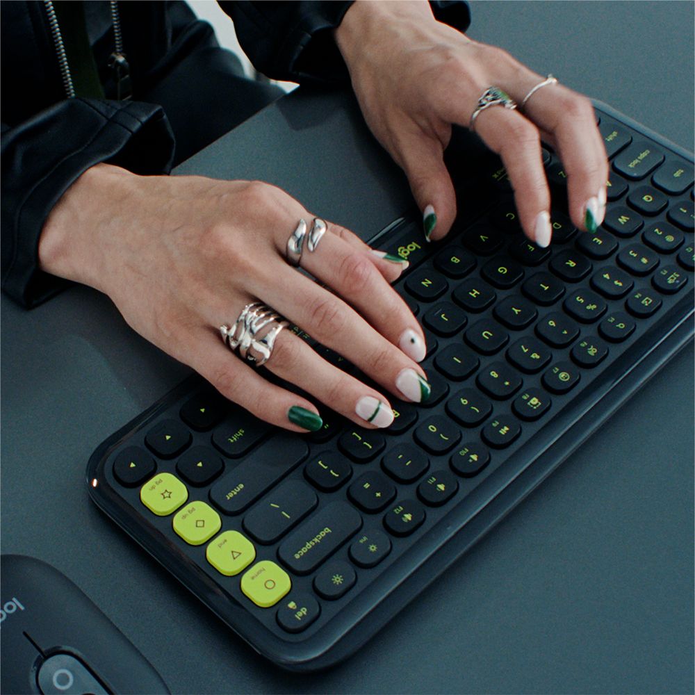 Δώσε στυλ στο γραφείο σου με το ασύρματο πληκτρολόγιο Pop Icon Keys, ένα μικρό πληκτρολόγιο με τολμηρή αισθητική και άνετη πληκτρολόγηση. Απόλαυσε άνεση με τα εργονομικά πλήκτρα χαμηλού προφίλ για άνετη, εμπειρία πληκτρολόγησης χαμηλού θορύβου που θυμίζει φορητό υπολογιστή και κάνε τη ζωή σου πιο εύκολη με τα προσαρμόσιμα πλήκτρα ενεργειών και την εφαρμογή Logi Options+, με εναλλαγή μεταξύ εργασίας και διαλείμματος χωρίς κόπο.