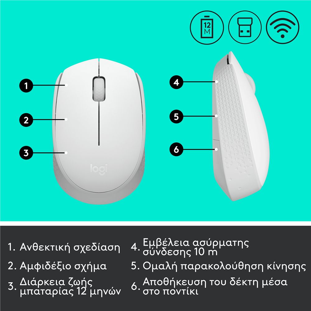 Ασύρματο ποντίκι Logitech M171 Λευκό για PC, Mac και φορητό υπολογιστή, 2,4 GHz, με μίνι δέκτη USB, οπτική παρακολούθηση κίνησης, 12μηνη διάρκεια ζωής μπαταρίας και αμφιδέξια σχεδίαση