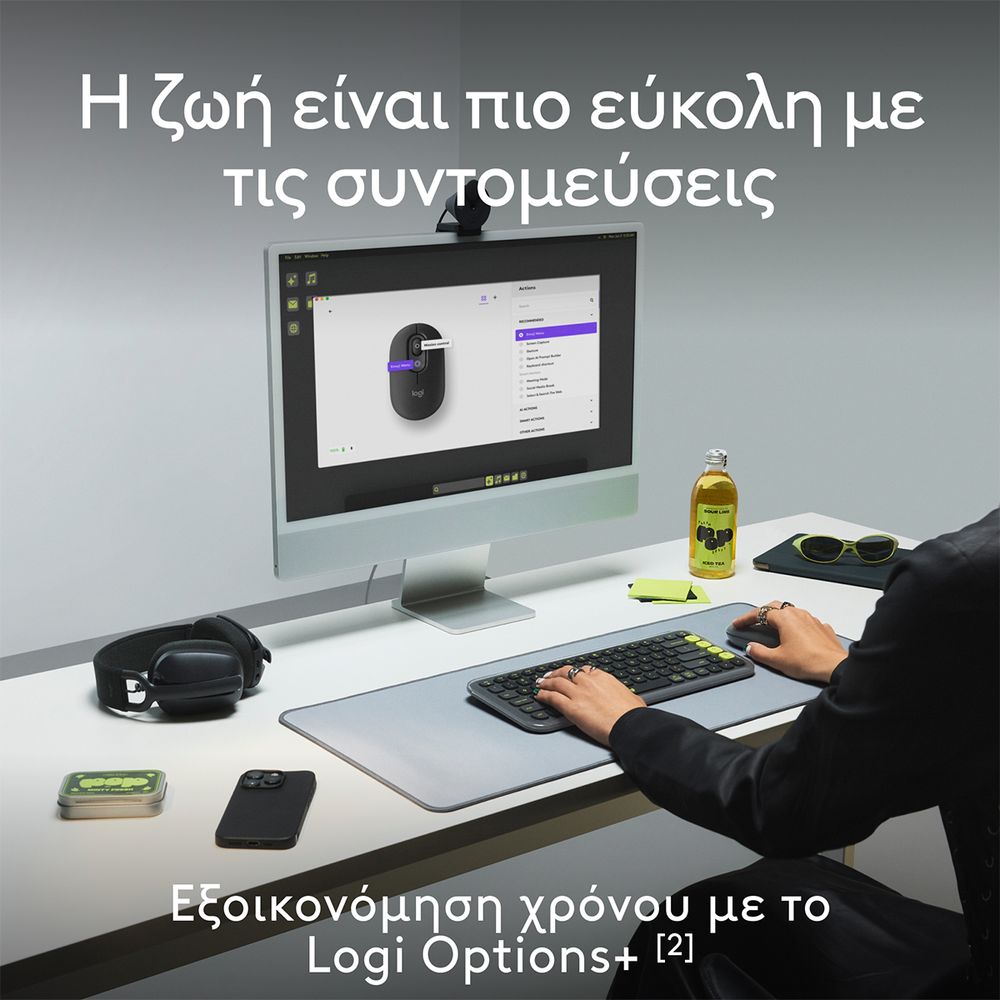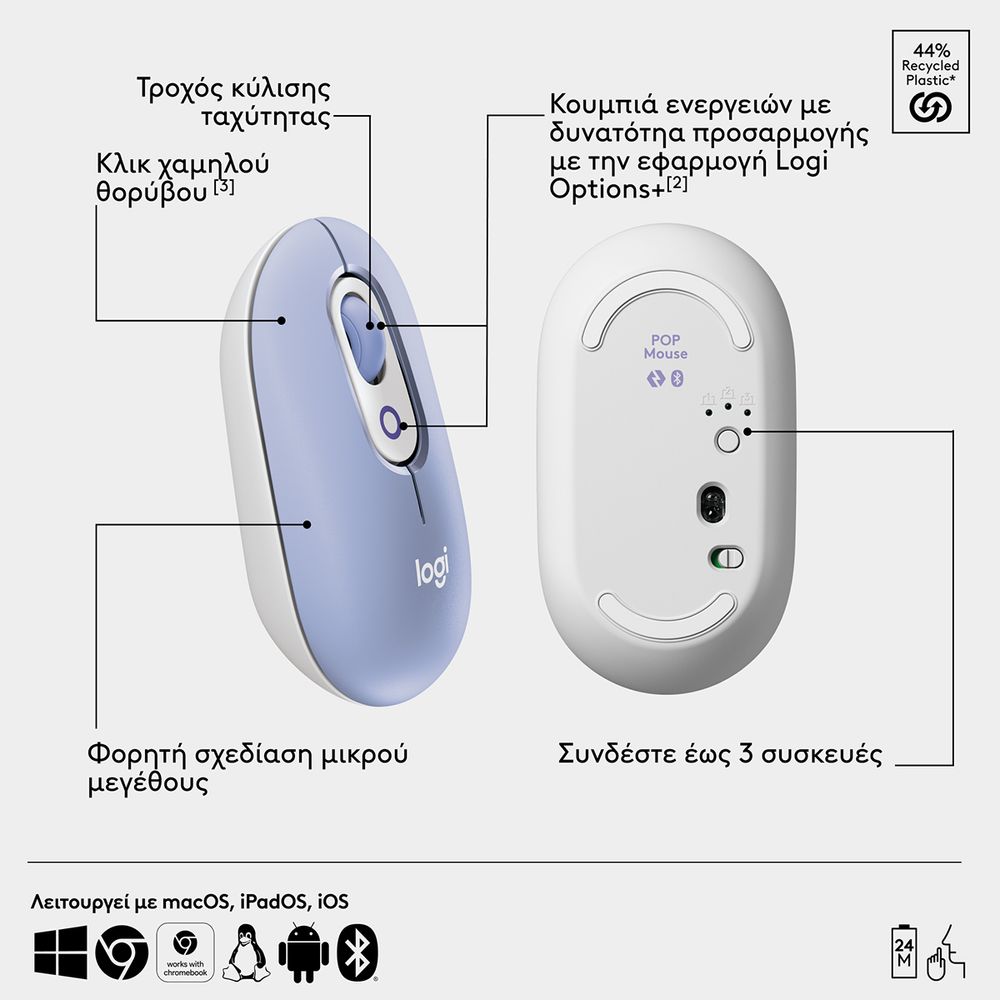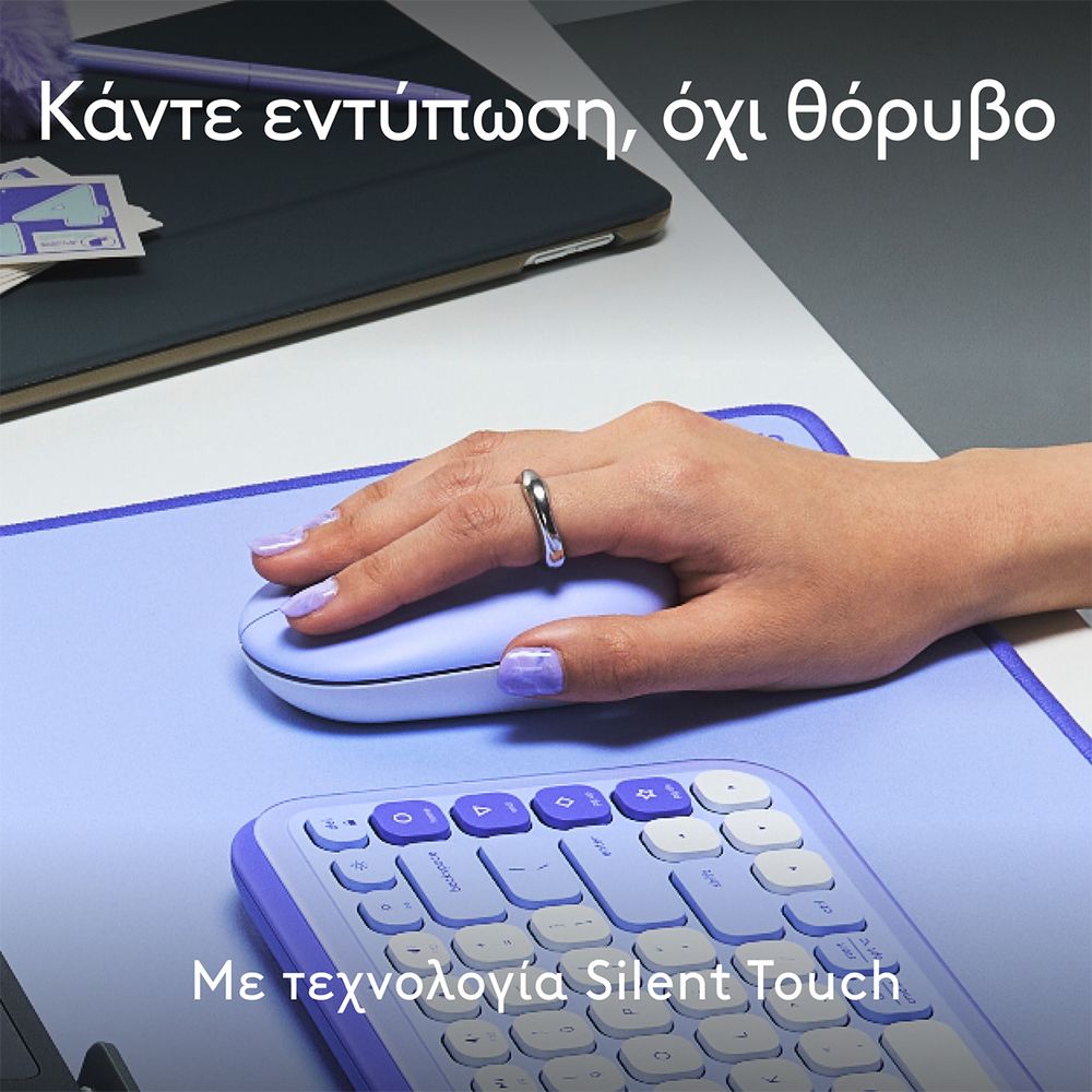 Δώσε στυλ στον χώρο σου με το POP Mouse. Αυτό το ασύρματο ποντίκι έχει σχεδιαστεί έτσι ώστε να διαφέρει χάρη στο μικρό του μέγεθος, την εργονομική του σχεδίαση και τη δυνατότητα μείωσης θορύβου χάρη στην τεχνολογία Silent Touch που μειώνει τον θόρυβο των κλικ κατά 90%. Κάνε την ζωή σου πιο εύκολη με κουμπιά ενεργειών με δυνατότητα προσαρμογής και την εφαρμογή Logi Options+.