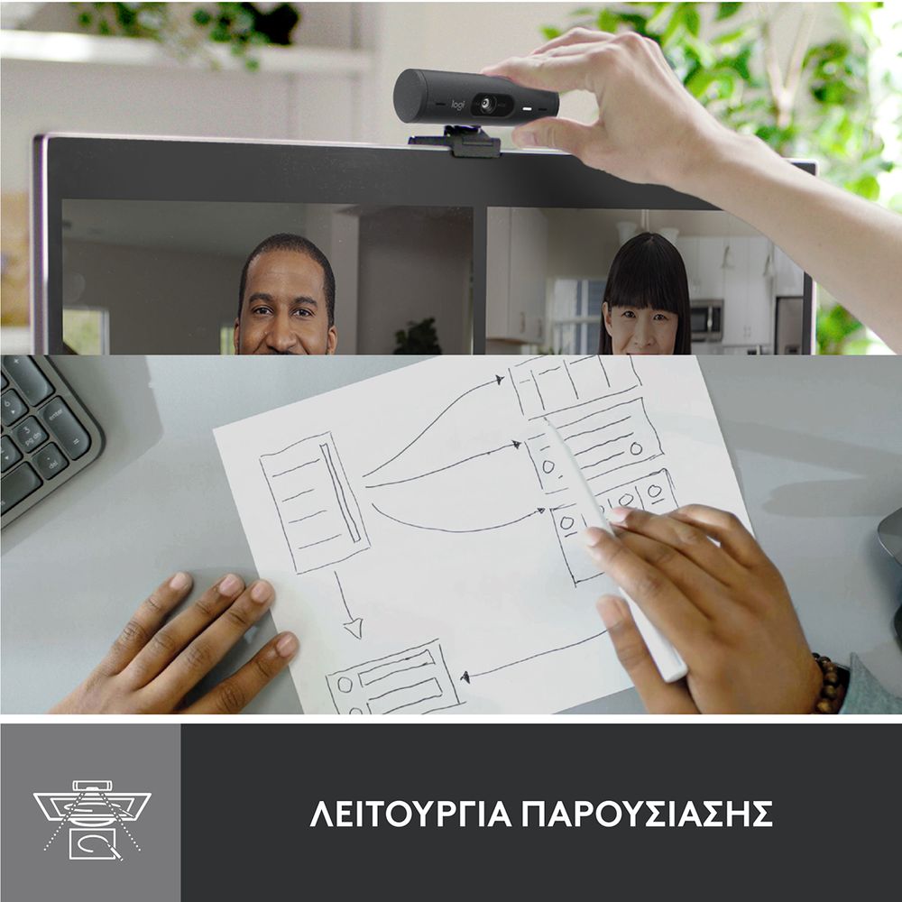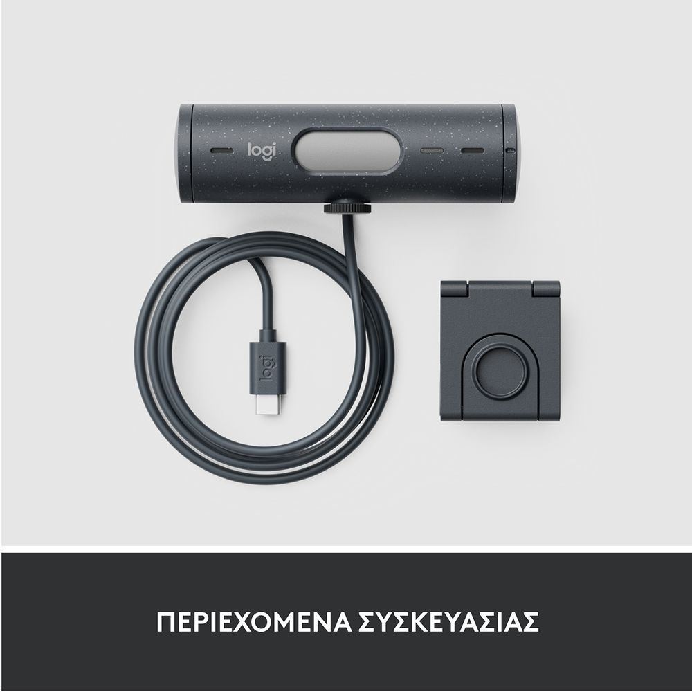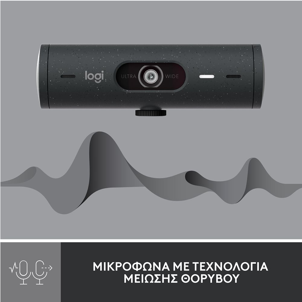 Logitech Brio 500 Full HD Webcam με αυτόματη διόρθωση φωτεινότητας, αυτόματο καδράρισμα, λειτουργία παρουσίασης, δύο μικρόφωνα μείωσης θορύβου, κάλυμμα φακού της webcam για ιδιωτικότητα, λειτουργεί με Microsoft Teams, Google Meet, Zoom.