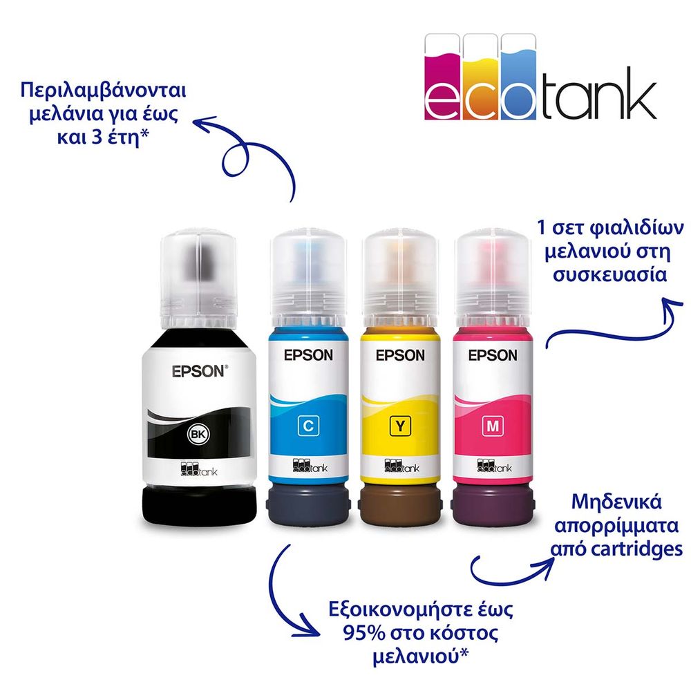 Ιδανικός για οικιακά γραφεία, αυτός ο εκτυπωτής inkjet με μεγάλη εύχρηστη οθόνη αφής, διαθέτει αναπληρούμενα δοχεία μελανιού, με ένα σετ φιαλιδίων που έχουν το ισοδύναμο έως 66 φυσίγγων*. Οι οικιακές λειτουργίες περιλαμβάνουν Wi-Fi, Wi-Fi Direct, σάρωση και αντιγραφή A4. Στα πρόσθετα χαρακτηριστικά ιδανικά για γραφεία περιλαμβάνονται το Ethernet, η αυτόματη εκτύπωση διπλής όψης, η οπίσθια τροφοδοσία χαρτιού A3+, ο μεγάλος μπροστινός δίσκος χαρτιού, ο τροφοδότης εγγράφων 35 σελίδων και το φαξ!