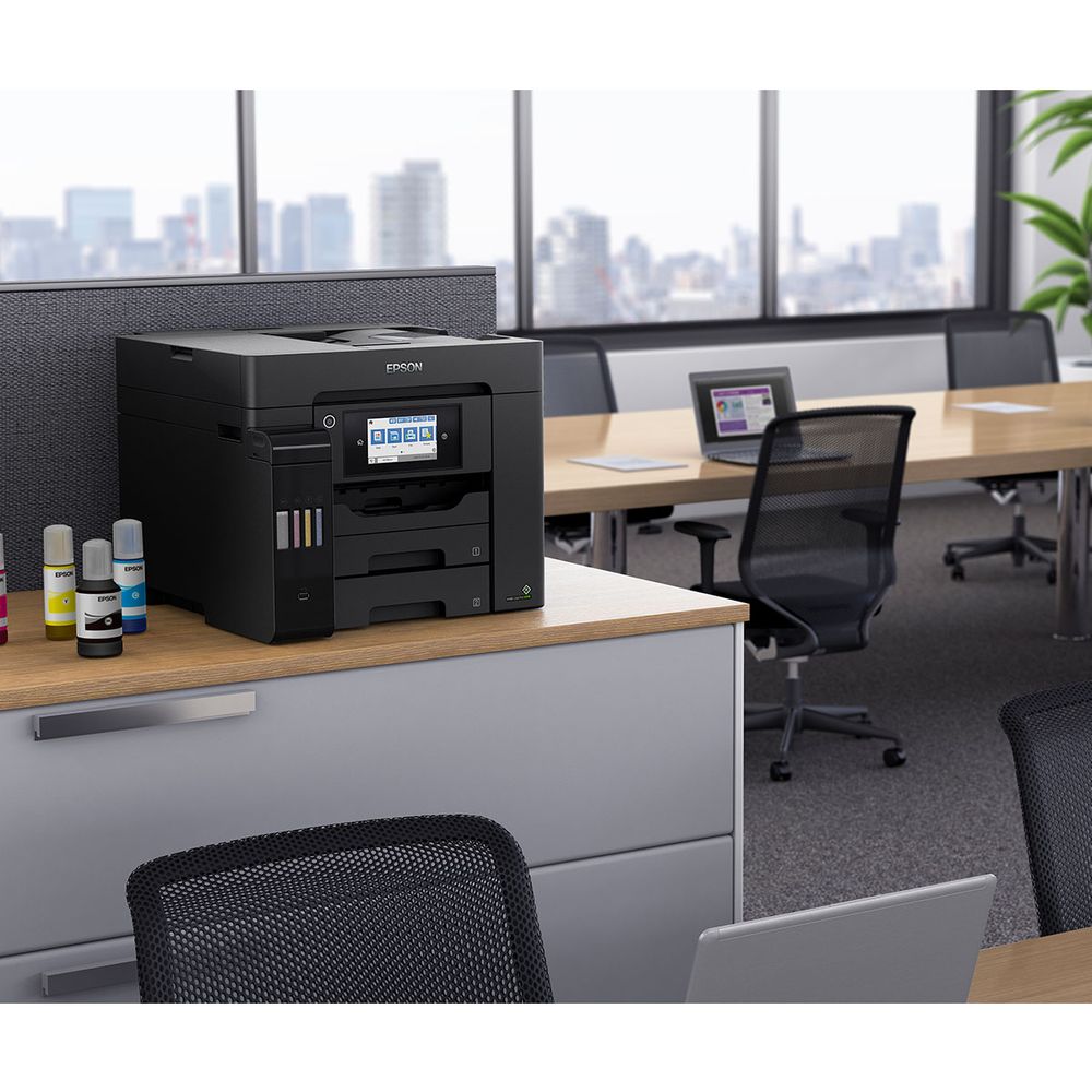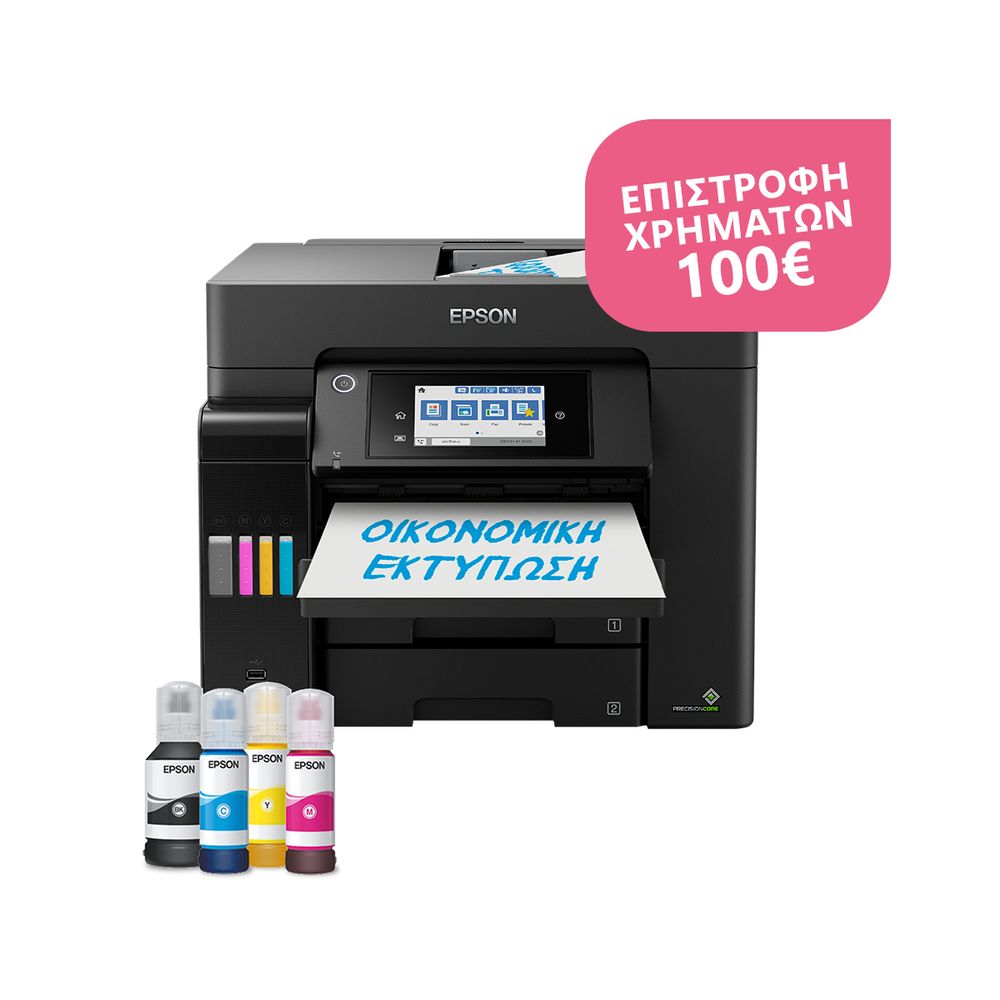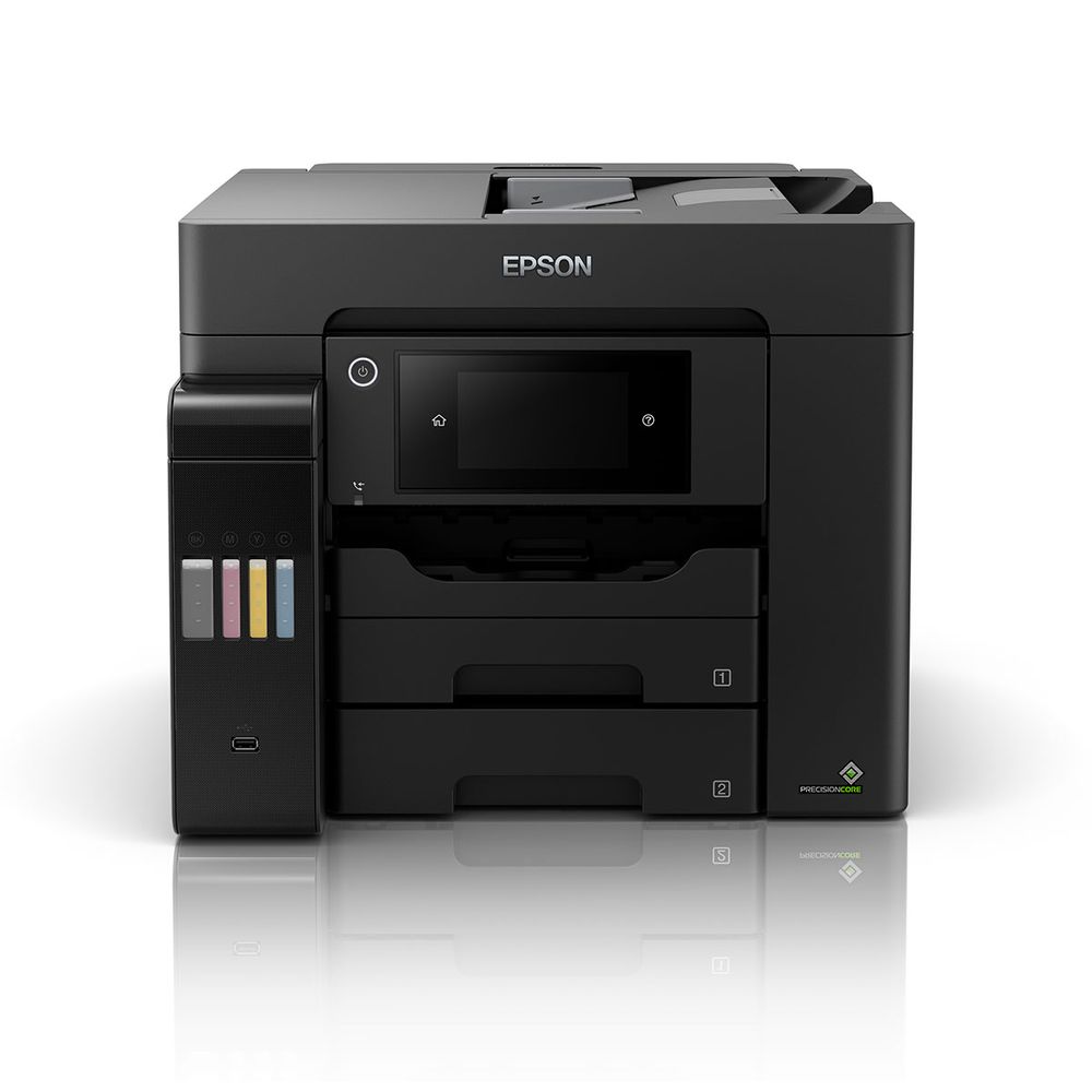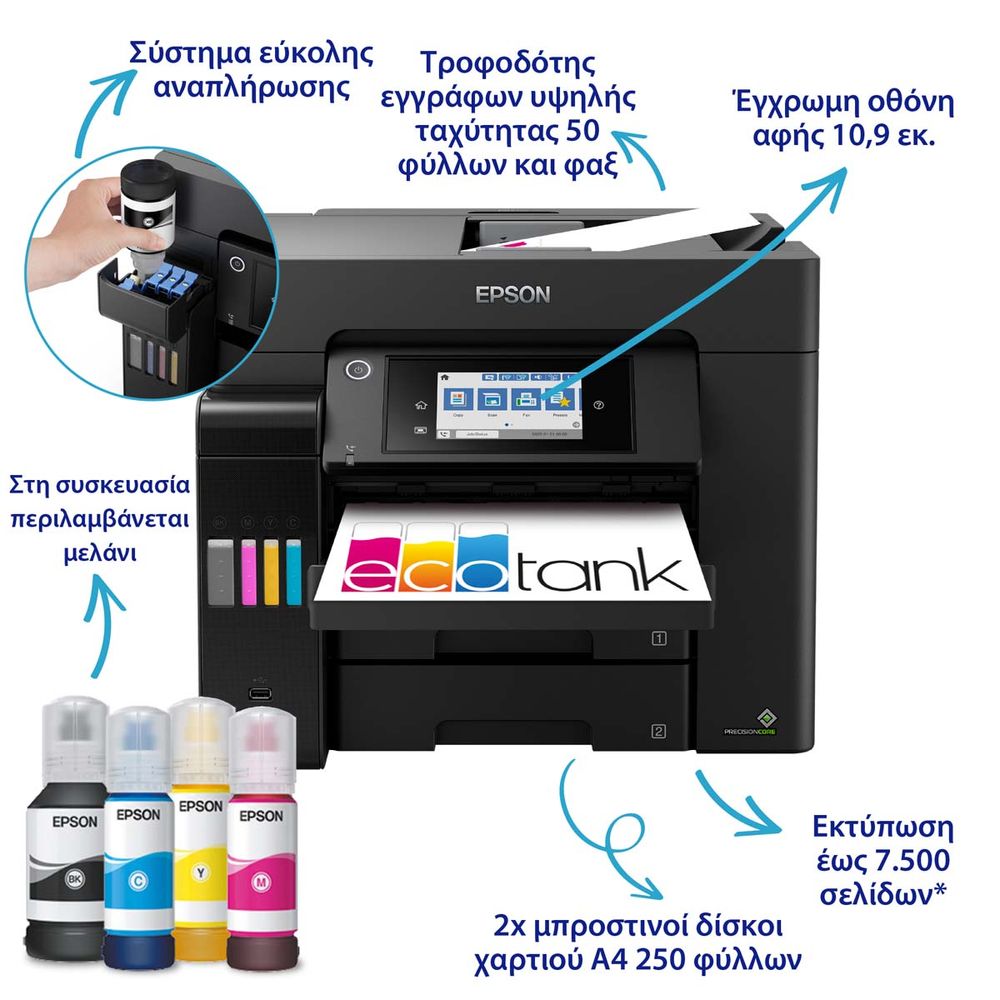 Απαραίτητος για τις επιχειρήσεις, αυτός ο γρήγορος πολυλειτουργικός εκτυπωτής A4 EcoTank διαθέτει δίσκο χαρτιού με χωρητικότητα 500 φύλλων, οπίσθια τροφοδοσία 50 φύλλων, αυτόματο τροφοδότη εγγράφων 50 φύλλων και φαξ. Τα αναπληρούμενα δοχεία μελανιού προσφέρουν μια λύση εκτύπωσης εξαιρετικά χαμηλού κόστους για γραφεία.