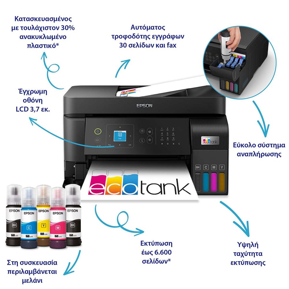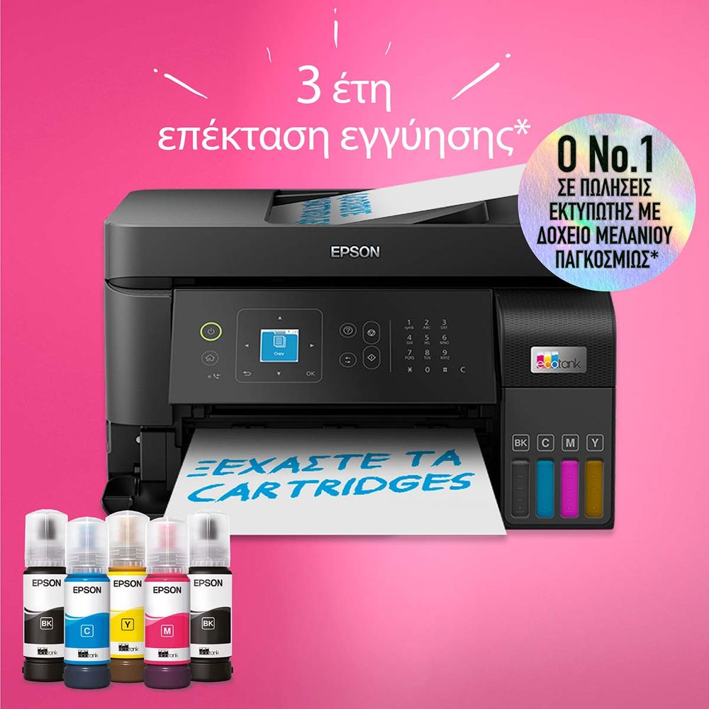 Ιδανικός για οικιακά περιβάλλοντα και μικρά γραφεία με συχνές ανάγκες εκτύπωσης, αυτός ο εκτυπωτής inkjet A4 διαθέτει επαναγεμιζόμενα δοχεία μελανιού και έως 66 cartridges σε ένα σετ ανταλλακτικών φιαλιδίων για εξαιρετικά χαμηλό κόστος εκτύπωσης ανά σελίδα. Οι οικιακές λειτουργίες περιλαμβάνουν Wi-Fi, Wi-Fi Direct, σάρωση και αντιγραφή. Στα επιπλέον επαγγελματικά χαρακτηριστικά περιλαμβάνονται το Ethernet, ο αυτόματος τροφοδότης εγγράφων 30 σελίδων και το φαξ.