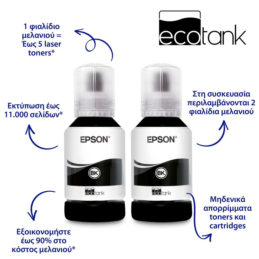 Ο εκτυπωτής EcoTank 3-σε-1 με δυνατότητα εκτύπωσης μέσω φορητών συσκευών διαθέτει Wi-Fi, οθόνη LCD, εκτύπωση διπλής όψης και δίσκο 250 φύλλων. Είναι ανθεκτικός, γρήγορος και αποδοτικός, προσφέροντας εκτύπωση, σάρωση και αντιγραφή με χαμηλό κόστος. Μειώνει το κόστος εκτύπωσης, παρέχοντας οικονομικά αποδοτική λύση για εκτύπωση έως 11.000 σελίδων με το συμπεριλαμβανόμενο μαύρο μελάνι. Επίλεξε γρήγορα τις λειτουργίες από την έγχρωμη οθόνη LCD 3,7 cm, για ευκολία και ταχύτητα στη χρήση.