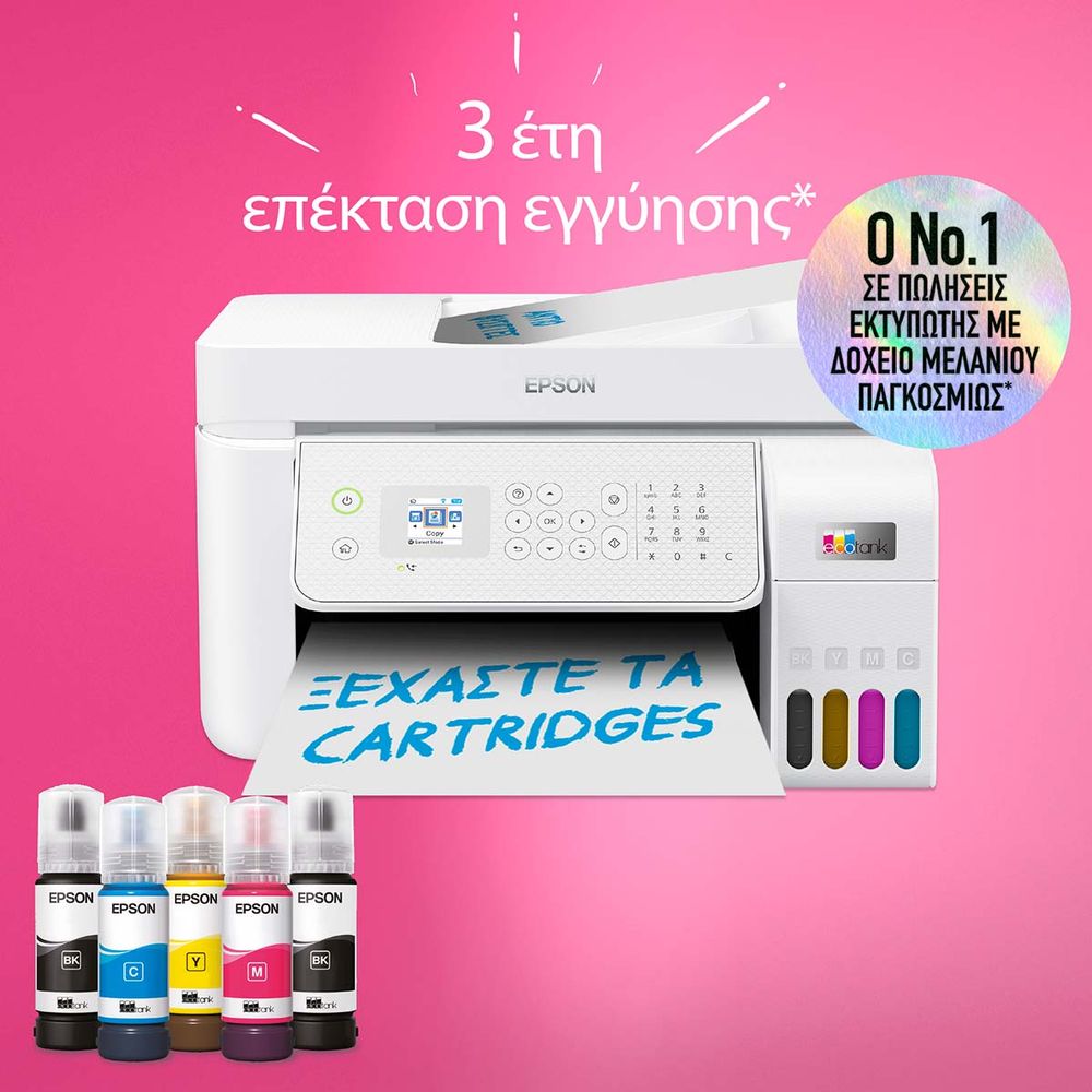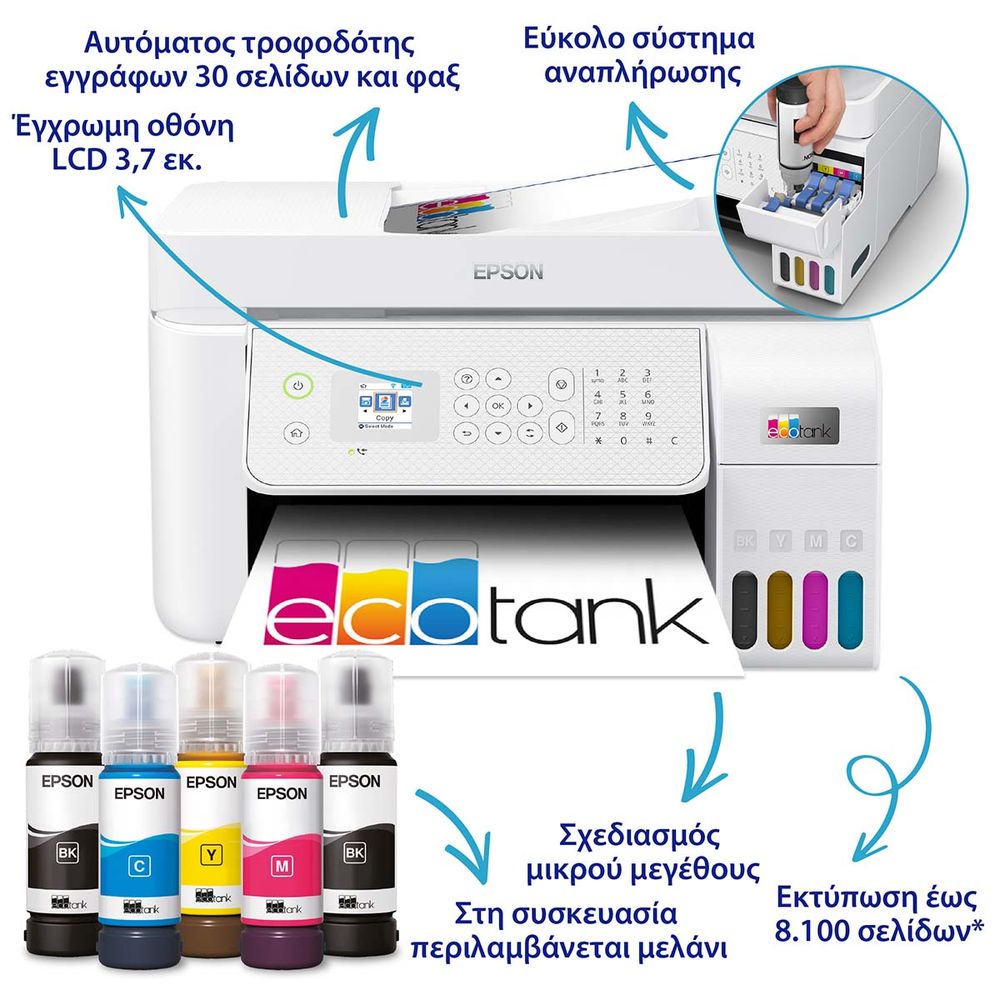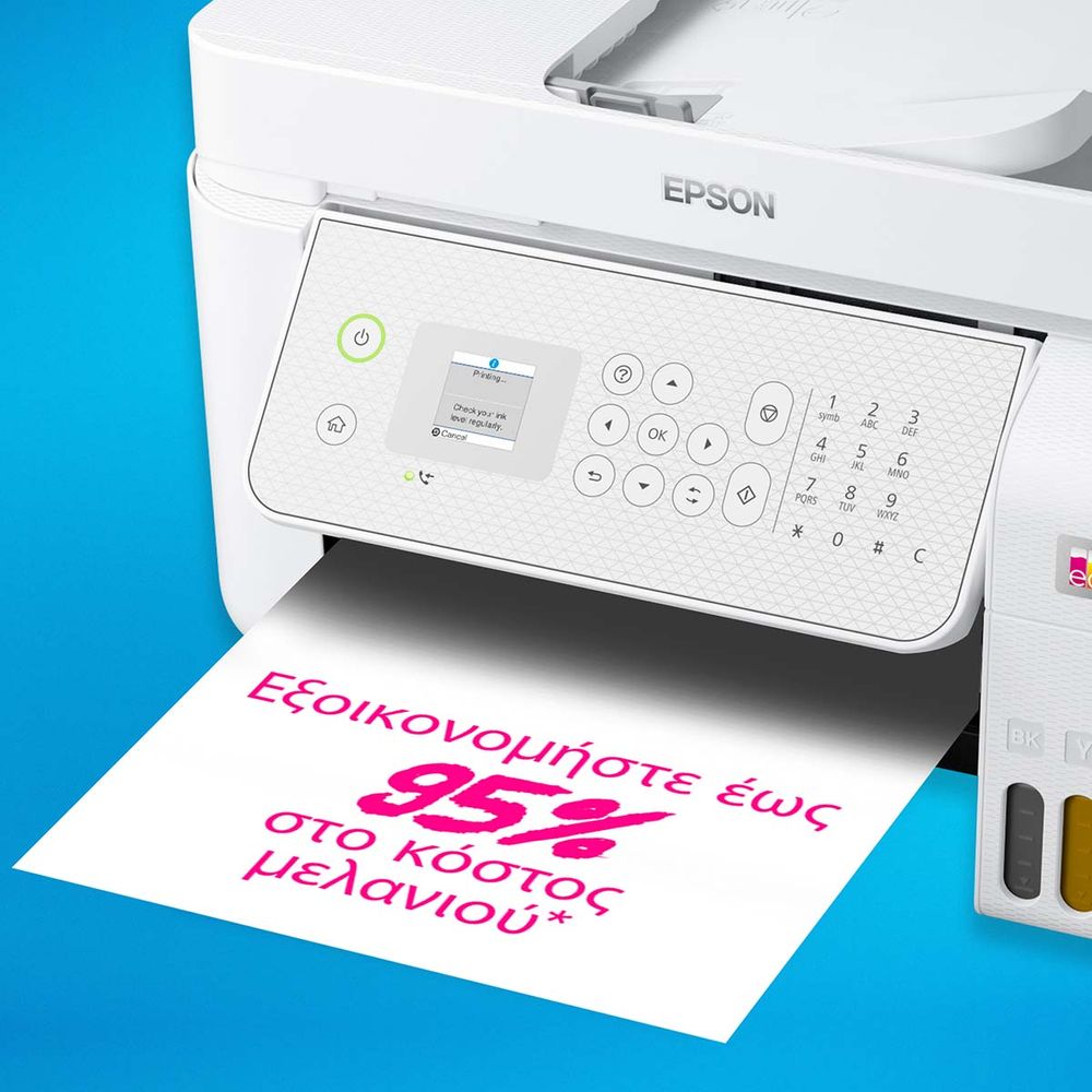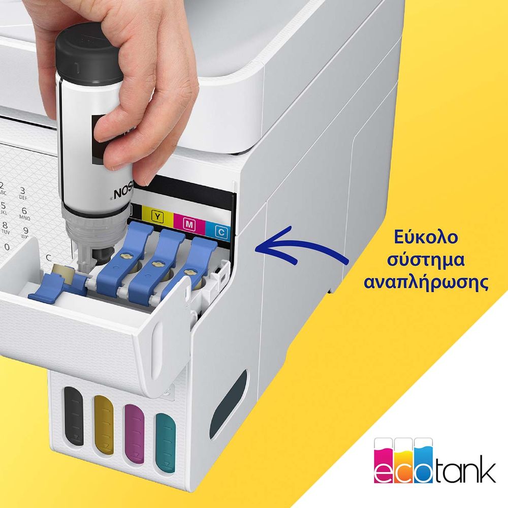 Ιδανικό για οικιακά περιβάλλοντα και μικρά γραφεία με συχνές ανάγκες εκτύπωσης, αυτό το πολυμηχάνημα inkjet A4 διαθέτει επαναγεμιζόμενα δοχεία μελανιού. Περιλαμβάνει ένα σετ φιαλιδίων μελανιών που ισοδυναμεί με έως 66 cartridges για χαμηλό κόστος εκτύπωσης ανά σελίδα. Οι λειτουργίες περιλαμβάνουν Wi-Fi, Wi-Fi Direct, σάρωση και αντιγραφή. Τα επαγγελματικά χαρακτηριστικά περιλαμβάνουν Ethernet, αυτόματο τροφοδότη 30 σελίδων και φαξ.