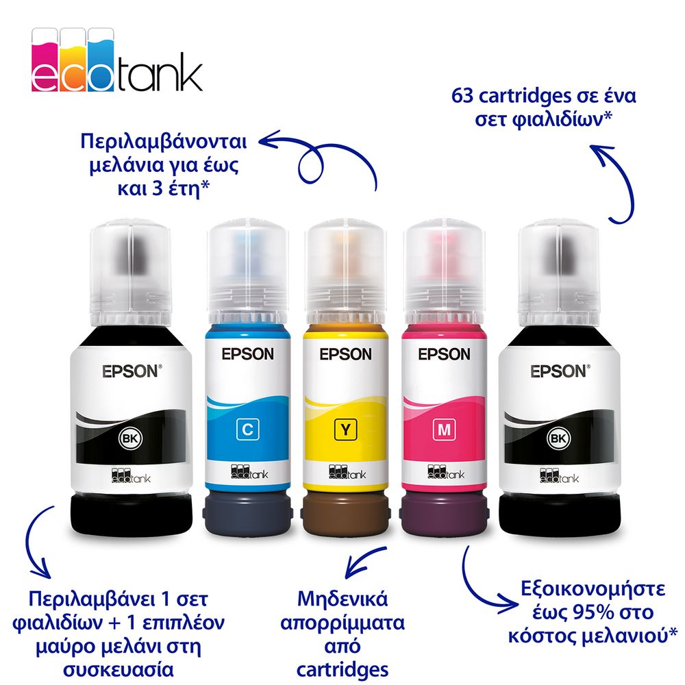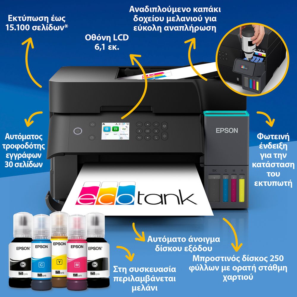 Με το Epson EcoTank L6370 λες αντίο στα cartridges και εξοικονομείς έως 95% στο κόστος εκτύπωσης. Γεμίζεις εύκολα τα επαναπληρούμενα δοχεία μελανιού και παρακολουθείς τη στάθμη από την μπροστινή οθόνη ή την μπλε λυχνία. Εκτυπώνεις έως 18 σελίδες/λεπτό, σαρώνεις και αντιγράφεις με αυτόματη διπλή όψη, χρησιμοποιώντας την οθόνη LCD 6,1 εκ. Αξιοποίησε τον ADF 30 φύλλων, εκτύπωση χωρίς περιθώρια έως A4, και σύνδεση Wi-Fi, Wi-Fi Direct ή Ethernet για εκτύπωση από κάθε συσκευή, απολαμβάνοντας αντοχή, οικονομία και ευελιξία.