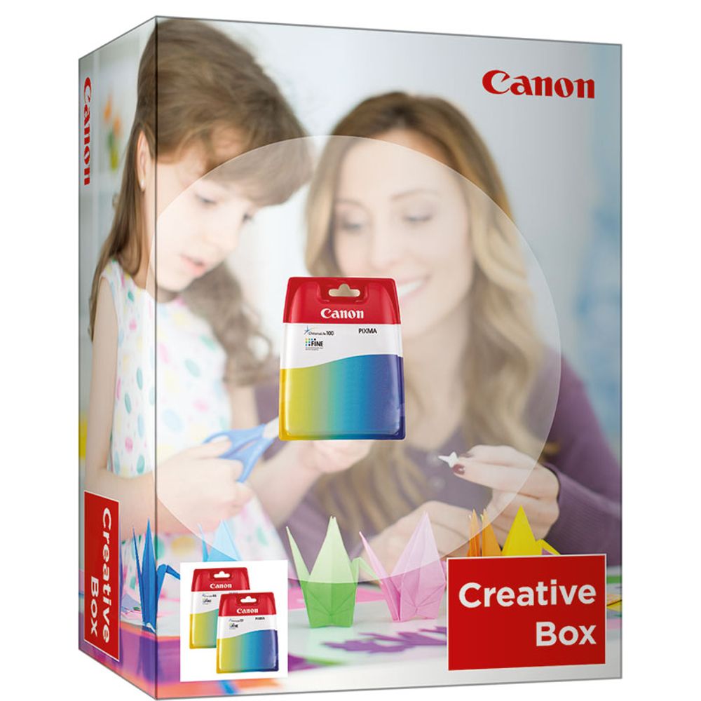Συσκευασία Creative Box της Canon, η οποία περιλαμβάνει δύο μελάνια, το PG512 και το CL513, ένα πακέτο 500 σελίδων A4 χαρτί και μία κασετίνα, η οποία περιέχει μία κόλλα, ένα ψαλίδι, μία γόμα κι έναν χάρακα.