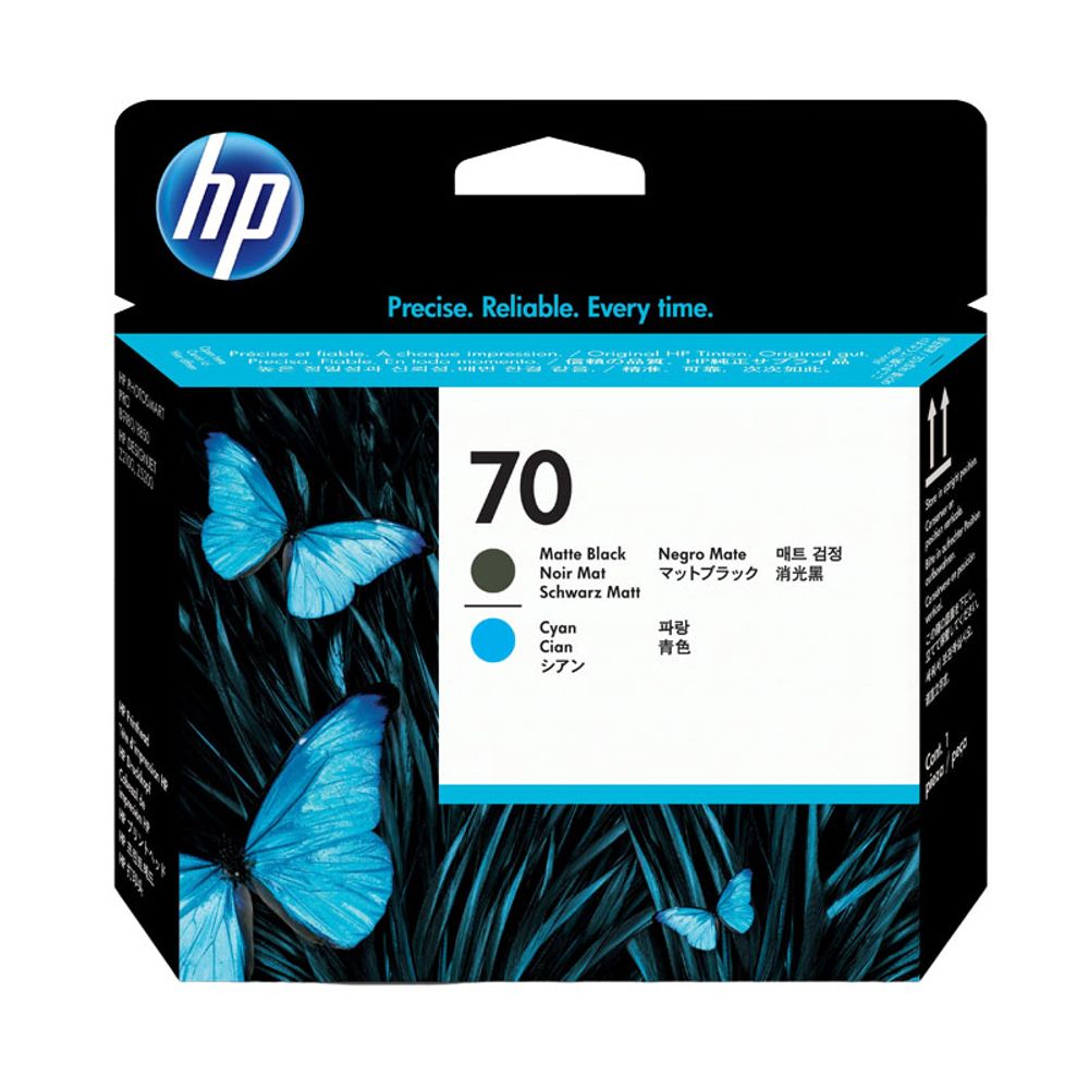 Κεφαλή εκτύπωσης HP 70 σε συνδυασμό ματ μαύρου και κυανού χρώματος. Εξασφαλίζει άψογη απόδοση χρωμάτων και καθαρές εκτυπώσεις σε επαγγελματικές εφαρμογές.