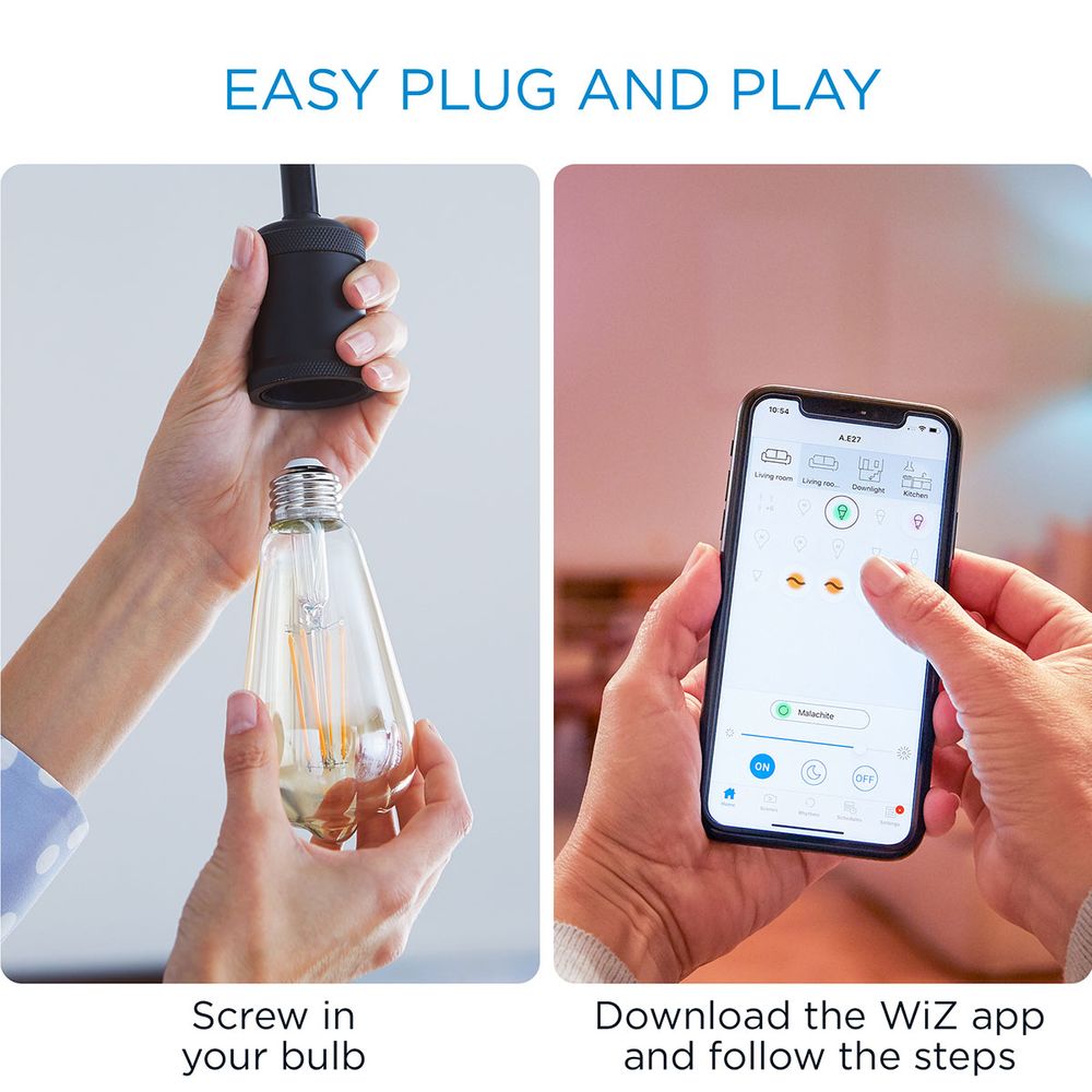Φώτισε τη ζωή σου με τον έξυπνο vintage λαμπτήρα WiZ LED ST64, που έχει κλασική εμφάνιση με επικάλυψη από κεχριμπάρι, ιδανική για διακοσμητικά είδη. Επίλεξε από διαφορετικές αποχρώσεις ζεστού έως δροσερού λευκού για να δημιουργήσεις την καλύτερη ατμόσφαιρα, ενώ μπορείς επίσης να ορίσεις ένα πρόγραμμα για να ανάβεις και να σβήνεις τα φώτα σύμφωνα με τις καθημερινές ή εβδομαδιαίες ρουτίνες σου, να τα ελέγχεις με το smartphone ή τη φωνή σου και να έχεις πρόσβαση ακόμα και όταν είσαι μακριά.
