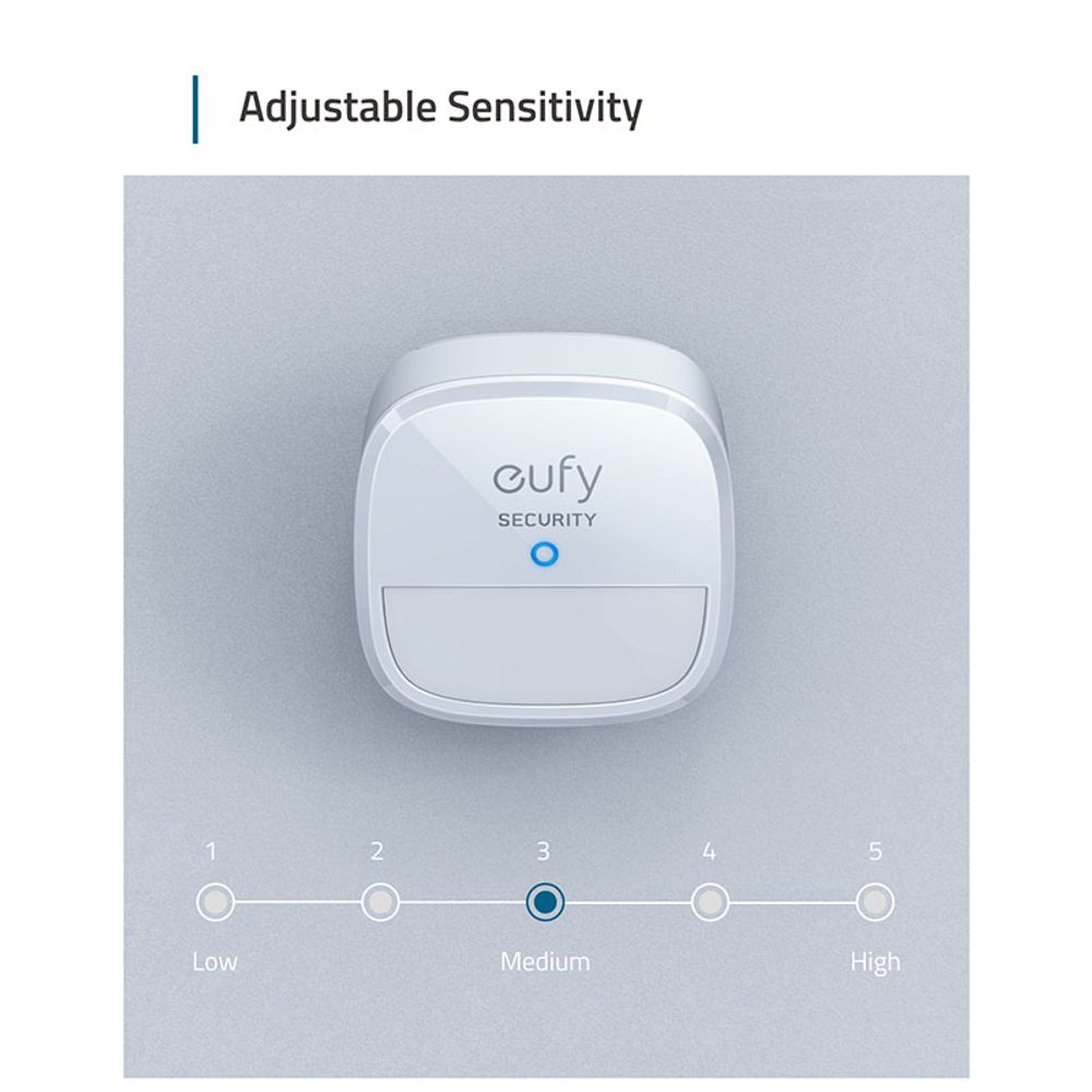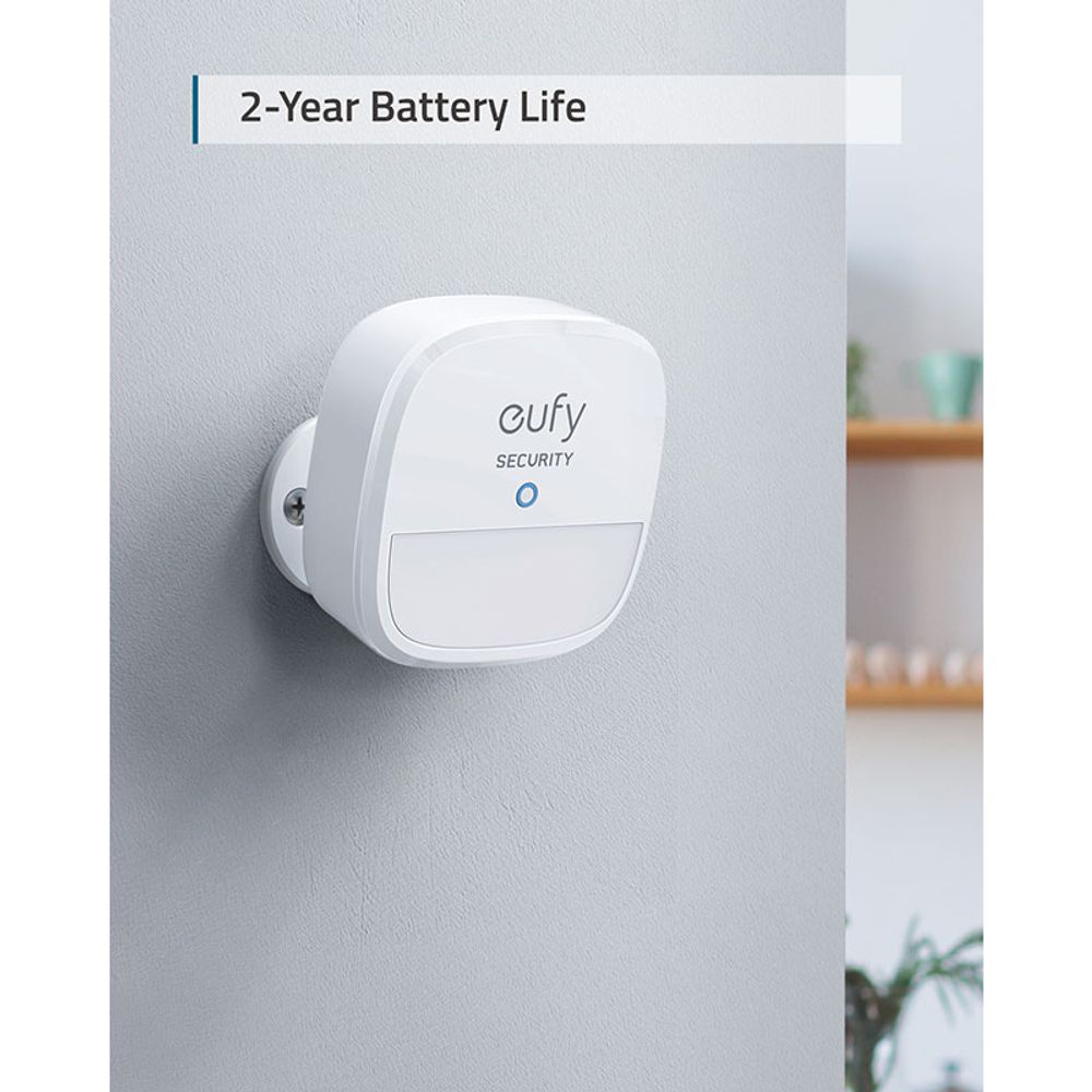The included battery provides up to 2 years of power, Detects motion within a 100° field of view, Tailor the sensitivity of the motion sensor so that it only alerts when humans are in range—rather than the playful pet dog or cat., Notifies you as soon as motion is detected, sending a message to your phone via the eufy Security app, Battery CR123A Battery. Requires Homebase 2 to work