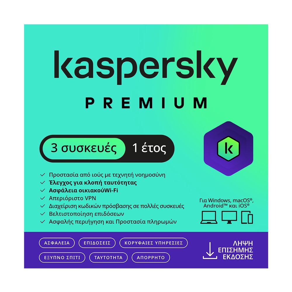 Προστάτεψε τα προσωπικά σου δεδομένα με το Kaspersky Premium 3 Devices 1 Year. Απόλαυσε κορυφαία ασφάλεια, απόδοση και ιδιωτικότητα σε κάθε σου συσκευή. Διασφάλισε την ταυτότητά σου με κρυπτογραφημένο πορτοφόλι για έγγραφα και έχεις προτεραιότητα υποστήριξης από ειδικούς που σε βοηθούν απομακρυσμένα. Ιδανικό για Windows, macOS, Android και iOS, σου προσφέρει την απόλυτη ηρεμία και προστασία που αξίζεις.