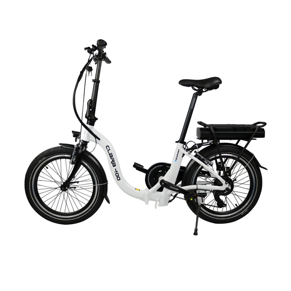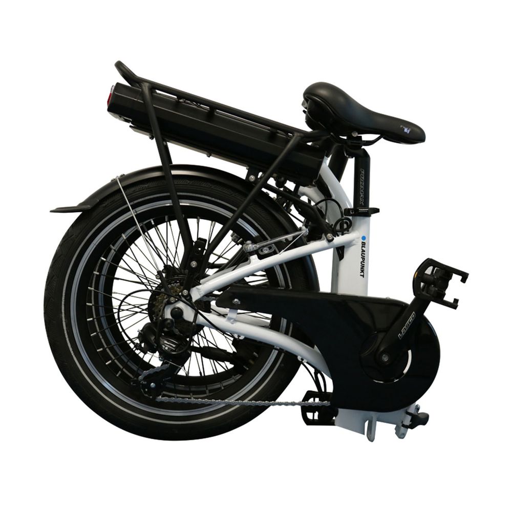 Πτυσσόμενο eBike Clara 400 από τη Blaupunkt, εξοπλισμένο με αφαιρούμενη μπαταρία και πρακτικό ράφι αποσκευών. Έχει βάρος περίπου 17,5 kg (συμπεριλαμβανομένης της μπαταρίας) και ταχύτητα έως και 60 χλμ/ω.