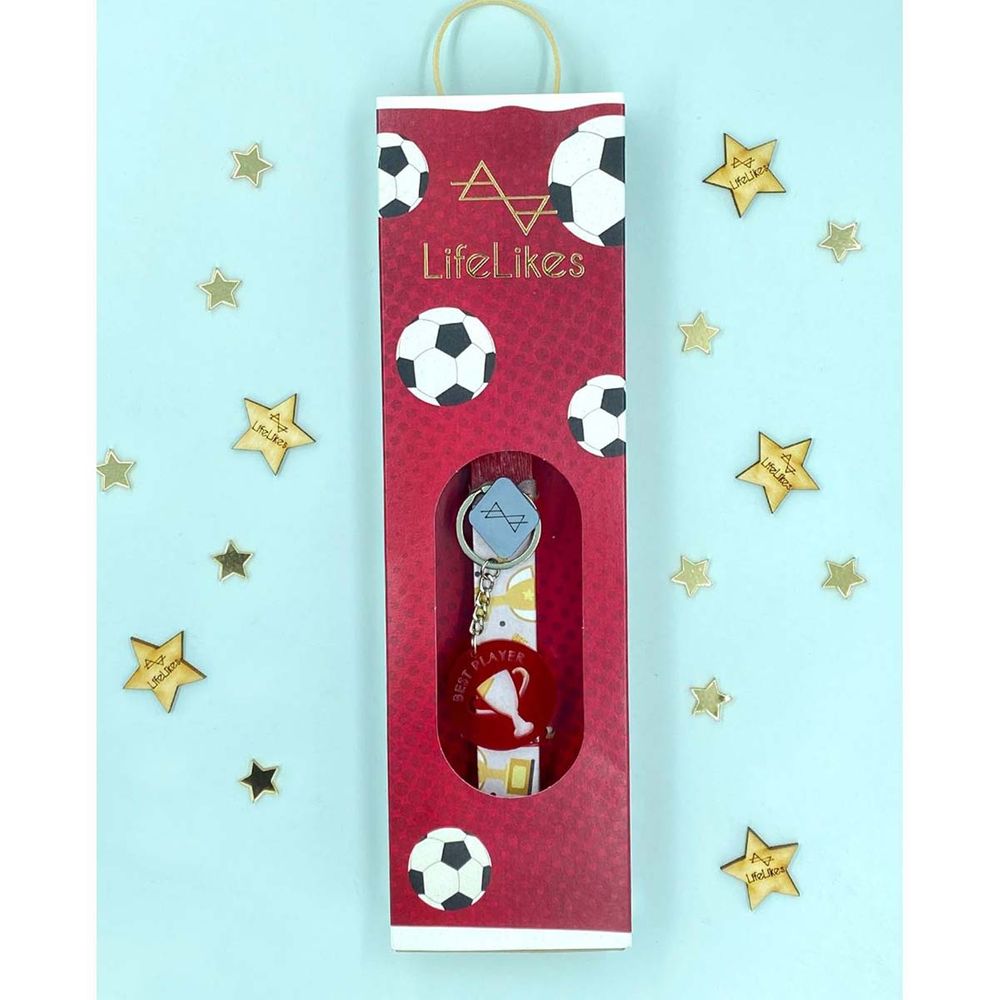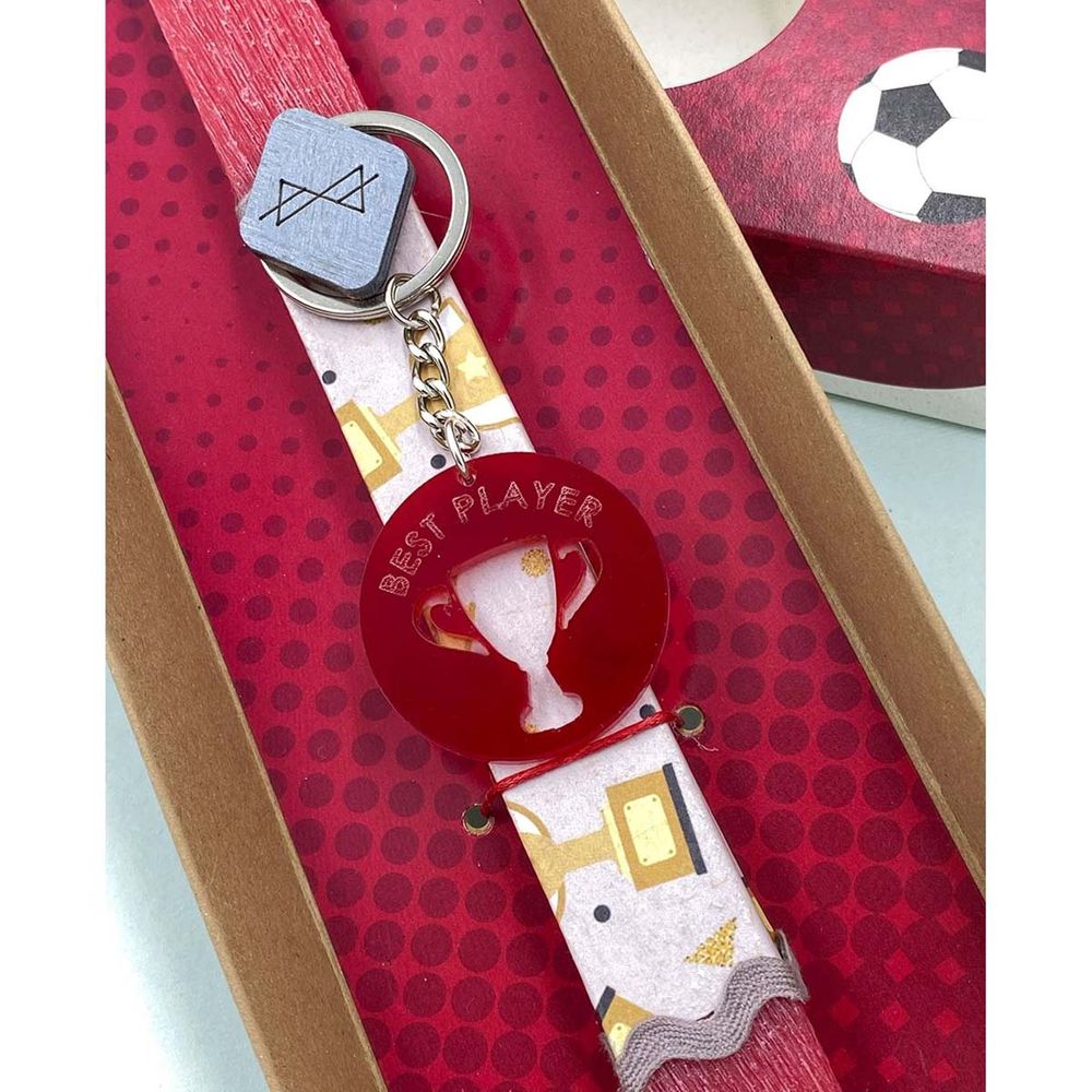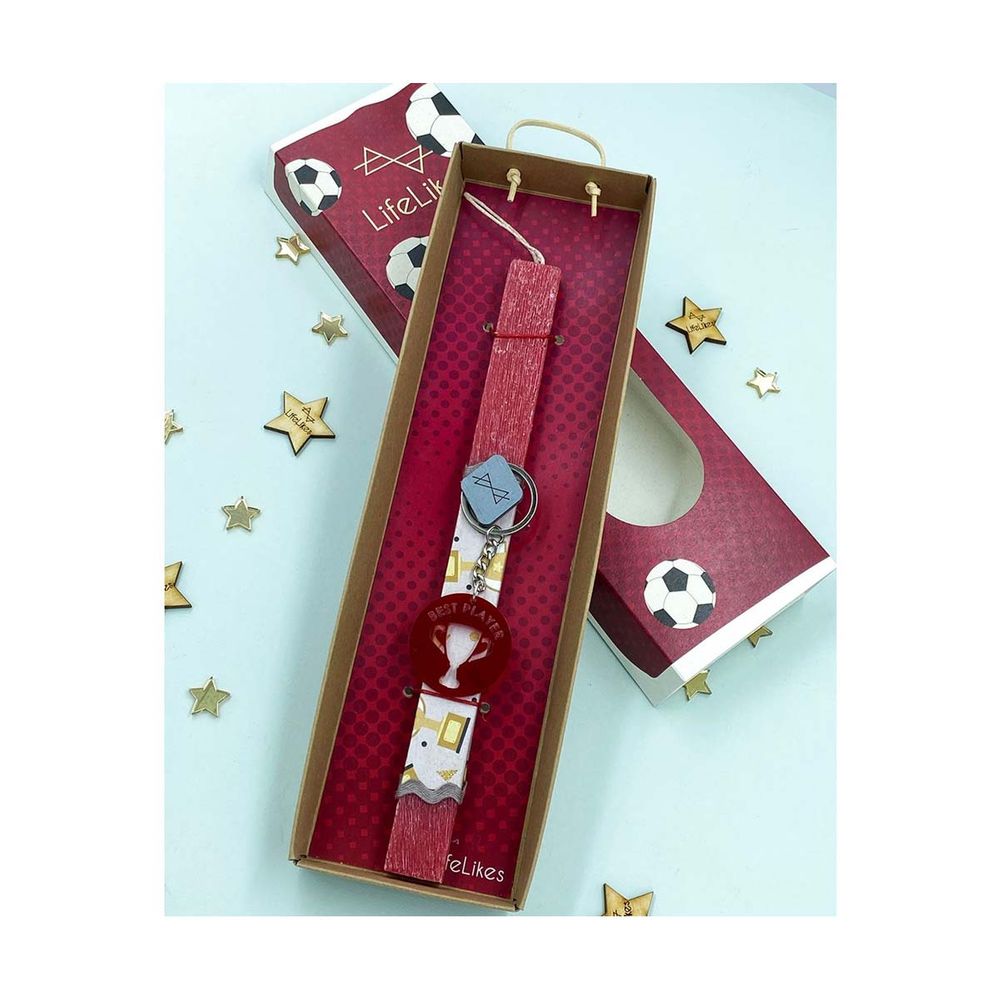 Αυτή η πασχαλινή λαμπάδα έχει σχεδιαστεί για όλα τα παιδιά που αγαπάνε το ποδόσφαιρο! Είναι τοποθετημένη μέσα σε κουτί, κόκκινου χρώματος, και έχει δώρο ένα μπρελόκ με χαραγμένη τη φράση "Best Player" και διάτρητο κύπελο.