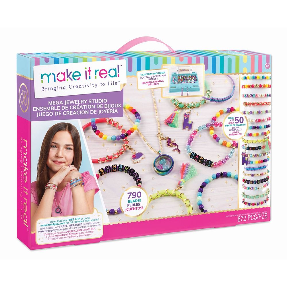 Δημιούργησε τα δικά σου κοσμήματα με το Make it Real Mega Studio. Το σετ περιέχει 793 διαφορετικές χάντρες, 5 διακοσμητικά διαμαντάκια, 7 m σε 7 διαφορετικά χρώματα κερωμένο κορδόνι, 3 μοτίφ, μεταλλικό λουκέτο, 1 μέτρο πλεκτό κορδόνι, 1.5 μέτρο σε 3 διαφορετικά χρώματα ελαστικό κορδόνι, 3 τεμάχια αλυσίδα τύπου χρυσή, 2 διακοσμητικά φουντάκια, 50 κρικάκια, 6 m διάφανο ελαστικό κορδόνι, βάση επεξεργασίας χαντρών, δίσκο τοποθέτησης και οδηγίες χρήσης