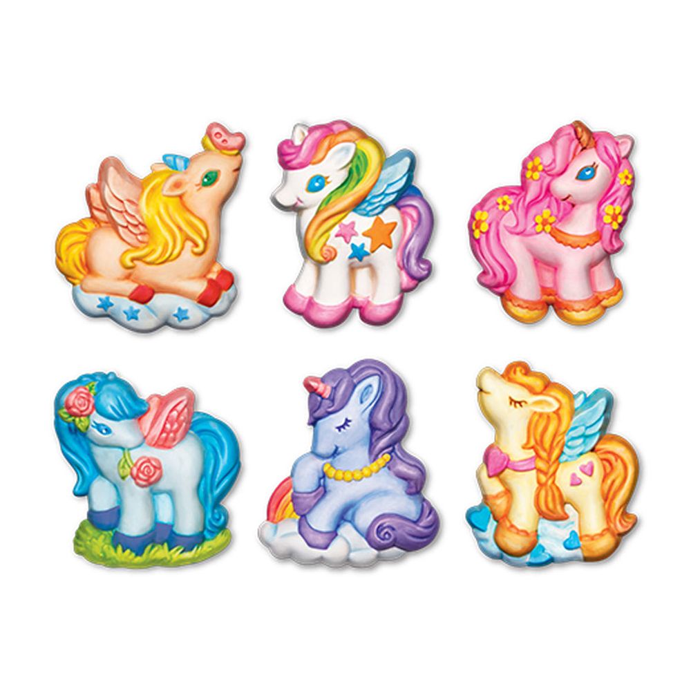 Δημιούργησε τα πιο χαριτωμένα μαγνητάκια μονόκερους! Βάλε τον γύψο στο καλούπι, χρωμάτισέ τα με χρώματα που σου αρέσουν και διακόσμησε το ψυγείο σου ή το δωμάτιό σου. Μπορούν να γίνουν και καρφίτσες για τα ρούχα σου. Περιέχονται οδηγίες στα Ελληνικά.