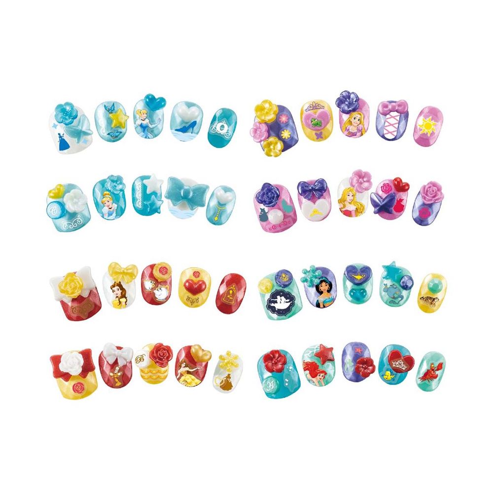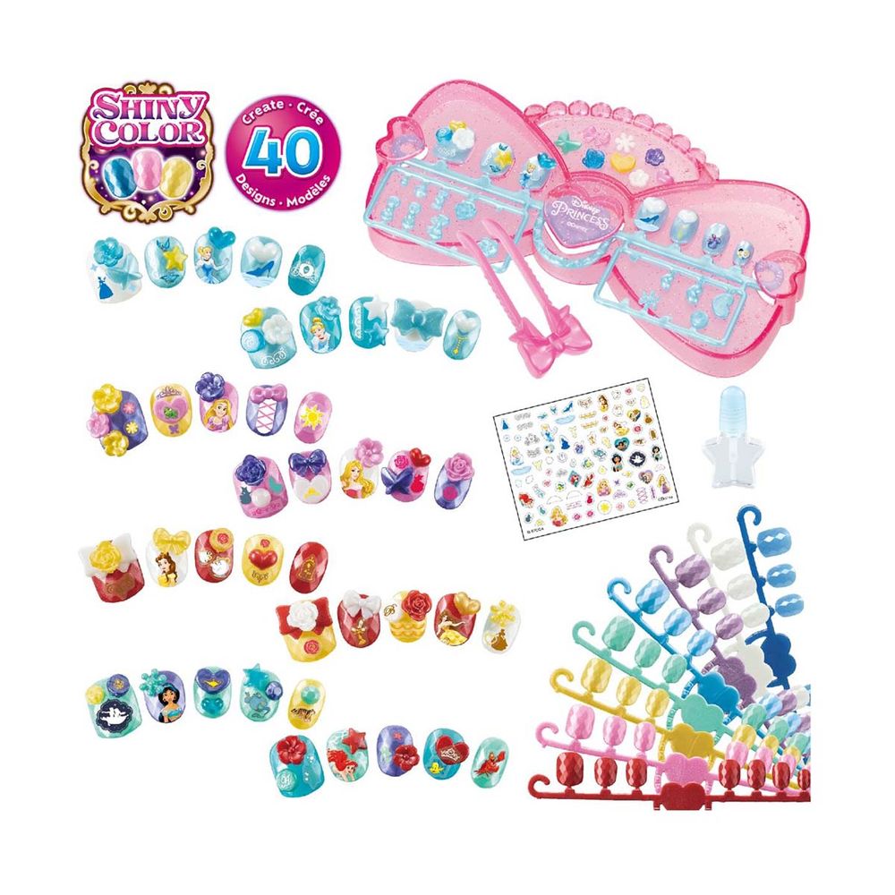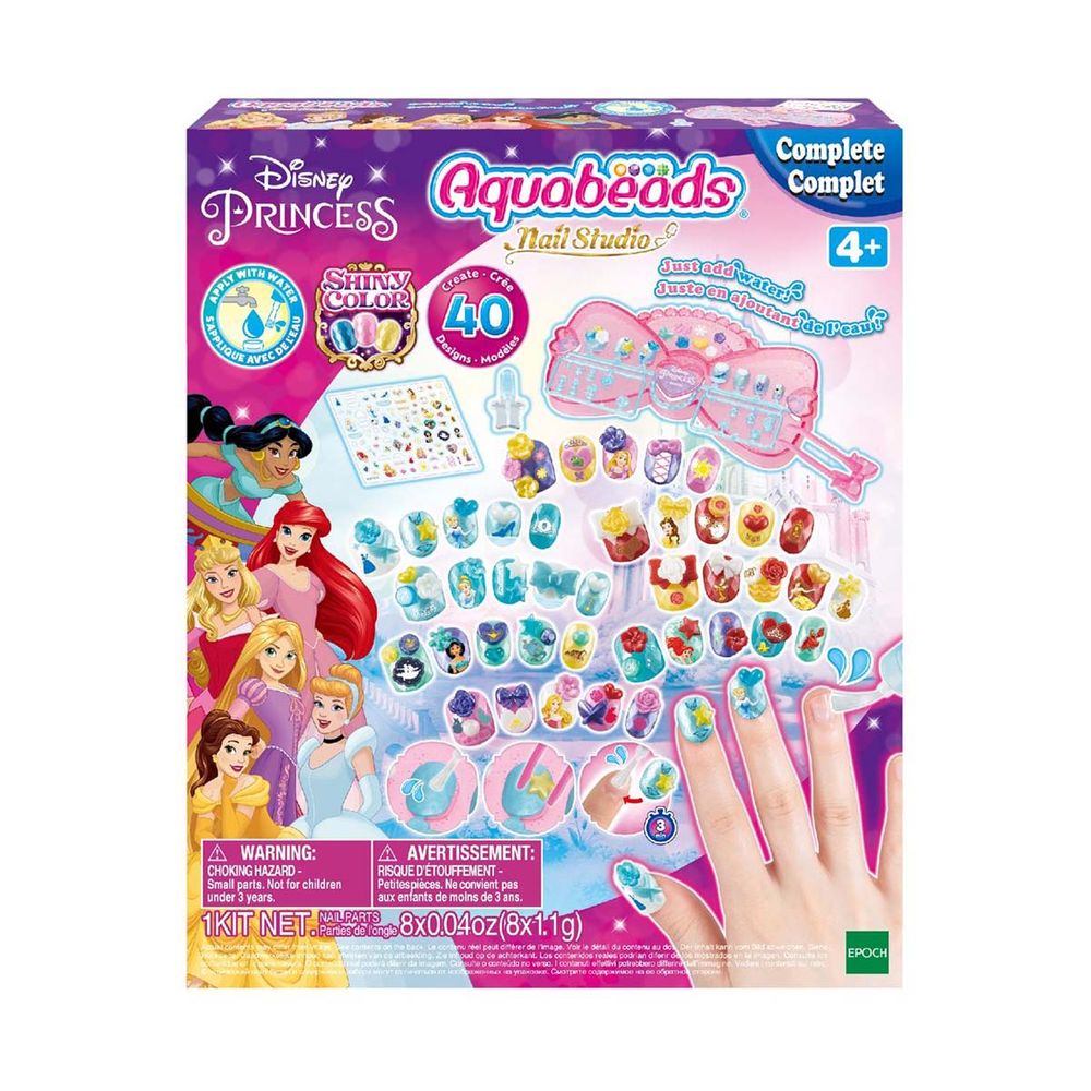 Το πλήρες σετ με χάντρες τέχνης και χειροτεχνίες περιλαμβάνει 40 νύχια Aquabeads με διακοσμητικά σε 8 χρώματα, επιφάνεια εργασίας, πλαστικό τσιμπιδάκι, εφαρμογή νερού με πινέλο, αυτοκόλλητα, φύλλο σχεδίασης και οδηγίες. Το φύλλο σχεδίασης περιλαμβάνει σχέδια νυχιών με Cinderella, Jasmine, Aurora, Rapunzel, Belle και Ariel, τα οποία μπορούν να κατασκευαστούν συναρμολογώντας συμπεριλαμβανόμενα νύχια Aquabeads και διακοσμητικά με νερό βρύσης.
