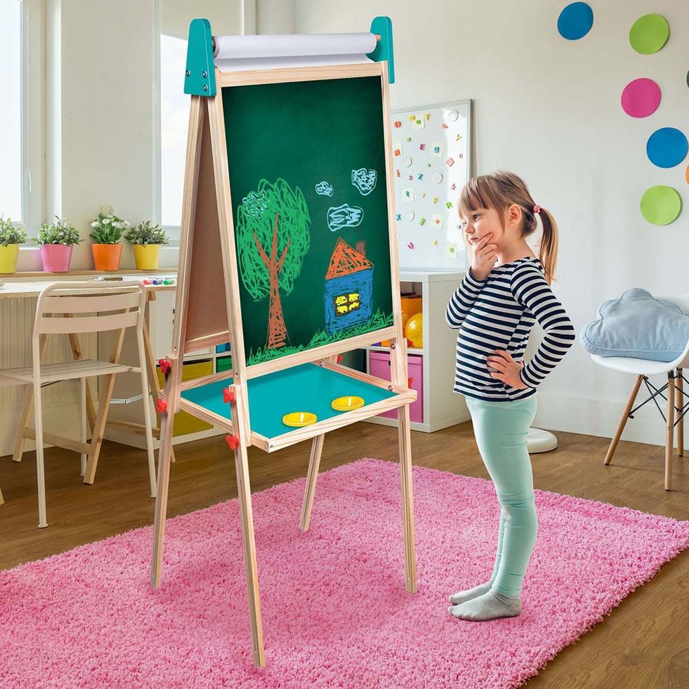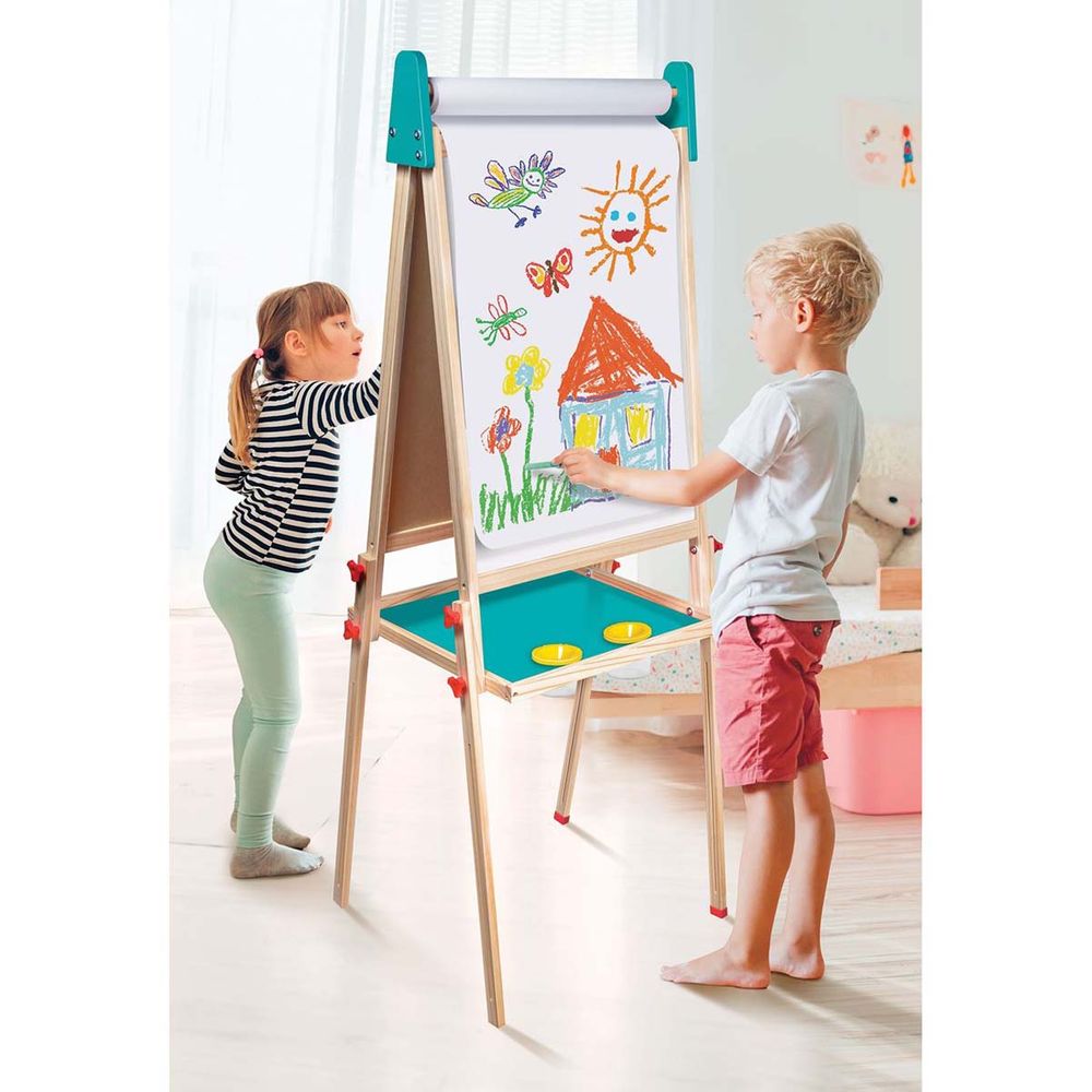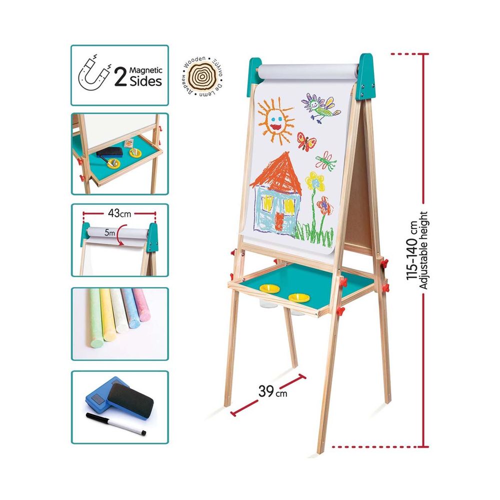 Ο μαγνητικός επιδαπέδιος πίνακας Mega Easel Deluxe συνδυάζει 4 τύπους δημιουργικής απασχόλησης για το παιδί μέσω του πίνακα μαρκαδόρου, του μαυροπίνακα, της ζωγραφικής σε ρολό χαρτί και του παιχνιδιού με μαγνήτες. Το ύψος του πίνακα διαμορφώνεται από 115 έως 140cm, έχει 2 μαγνητικές όψεις και ενδείκνυται για ελεύθερα σχέδια στον πίνακα μαρκαδόρου, για χρήση κιμωλίας στο μαυροπίνακα, αλλά και για μαγνητικό παιχνίδι.