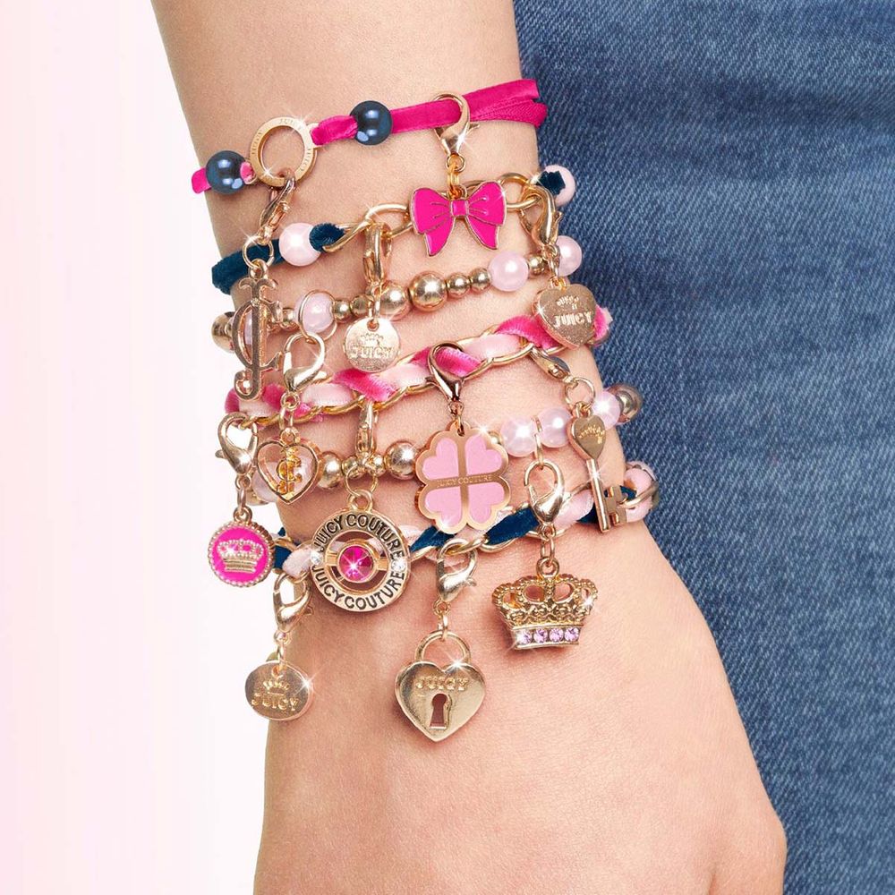 Σετ χειροτεχνίας που περιλαμβάνει 13 μενταγιόν Juicy Couture, 88 διαφορετικές χάντρες, 4 μενταγιόν με χάντρες, 2 μεγάλα δαχτυλίδια, 2 μακριές αλυσίδες, 1 κοντή αλυσίδα, 3 χρώματα βελούδινη κλωστή και διαφανές ελαστικό.