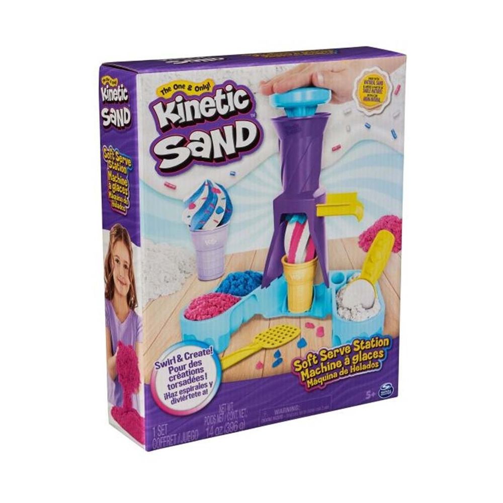 Ανακάτεψε και δημιούργησε με τον σταθμό Kinetic Sand Soft Serve Station! Για πρώτη φορά, τα παιδιά μπορούν να στροβιλίσουν την Kinetic Sand για να μιμηθούν την εμπειρία του παγωτού soft serve, όπως την έχουν δει στον πραγματικό κόσμο! Με 14 ουγκιές μπλε, ροζ και λευκή Kinetic Sand, δύο χωνάκια παγωτού και εργαλεία όπως μια κουτάλα με καλούπια για γλυκά και τρίφτη για πασπάλισμα, το παιδί σου μπορεί να σερβίρει ατελείωτες δυνατότητες παγωτού.\n