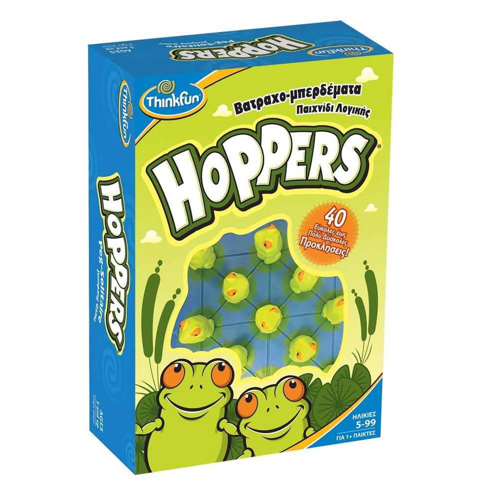 Το Hoppers είναι ένα ατομικό παιχνίδι σφηνώματος με πολύ χοροπηδητό. Τοποθέτησε τα βατραχάκια στη λιμνούλα και μετακίνησέ τα με τέτοιο τρόπο, ώστε να μείνει μόνο ένα όρθιο. Με 40 κάρτες προκλήσεων κλιμακούμενης δυσκολίας. Ξεκίνα με τις πρώτες κάρτες και ανέπτυξε τις δεξιότητες σου με κάθε επίπεδο. Θα είσαι το εξυπνότερο βατραχάκι της λιμνούλας σε χρόνο ρεκόρ.